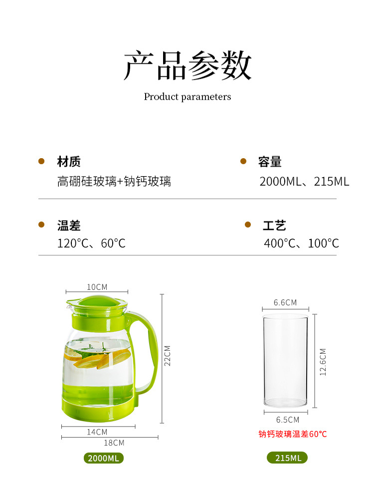 颜色 2000ml冷水壶白色 【防撞 耐温差120℃】,2000ml冷水壶黑色 【防撞 耐温差120℃】,2000ml冷水壶绿色 【防撞 耐温差120℃】,2000ml冷水壶白色+2高直升杯 【防撞 耐温差120℃】,2000ml冷水壶黑色+2高直升杯 【防撞 耐温差120℃】,2000ml冷水壶绿色+2高直升杯 【防撞 耐温差120℃】,2000ml冷水壶白色+4高直升杯 【防撞 耐温差120℃】,2000ml冷水壶黑色+4高直升杯 【防撞 耐温差120℃】,2000ml冷水壶绿色+4高直升杯 【防撞 耐温差120℃】,2000ml冷水壶白色+6高直升杯 【防撞 耐温差120℃】,2000ml冷水壶黑色+6高直升杯 【防撞 耐温差120℃】,2000ml冷水壶绿色+6高直升杯 【防撞 耐温差120℃】,2000ml冷水壶白色+4高直升杯+竹托盘 【防撞 耐温差120℃】,2000ml冷水壶黑色+4高直升杯+竹托盘 【防撞 耐温差120℃】,2000ml冷水壶绿色+4高直升杯+竹托盘 【防撞 耐温差120℃】