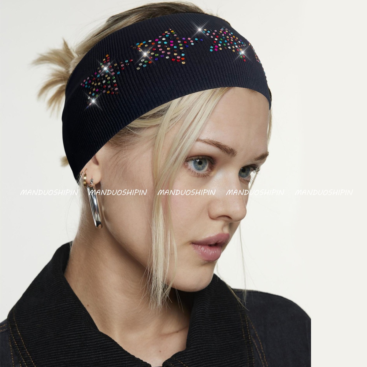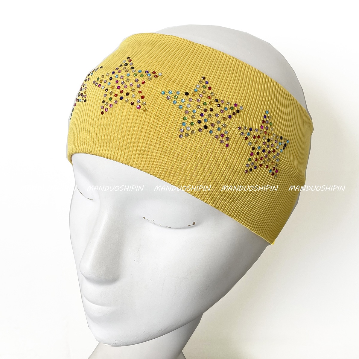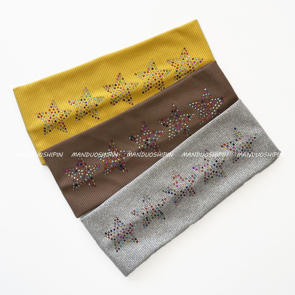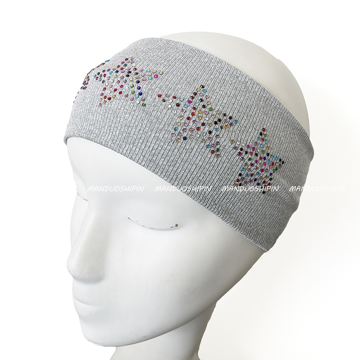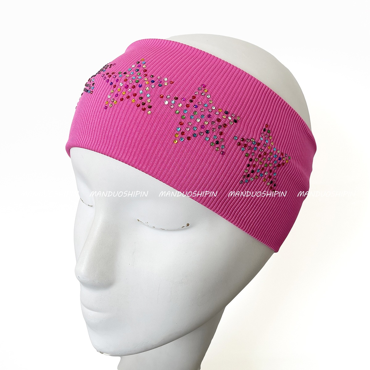 跨境亚马逊烫钻双排星星发带坑条纯色复古头饰宽边弹力运动头带女