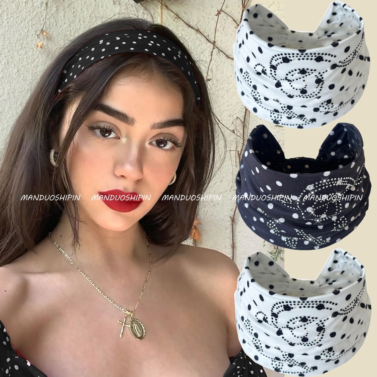 亚马逊跨境复古波点烫钻发带宽边打结包腰时尚发饰运动吸汗头巾女