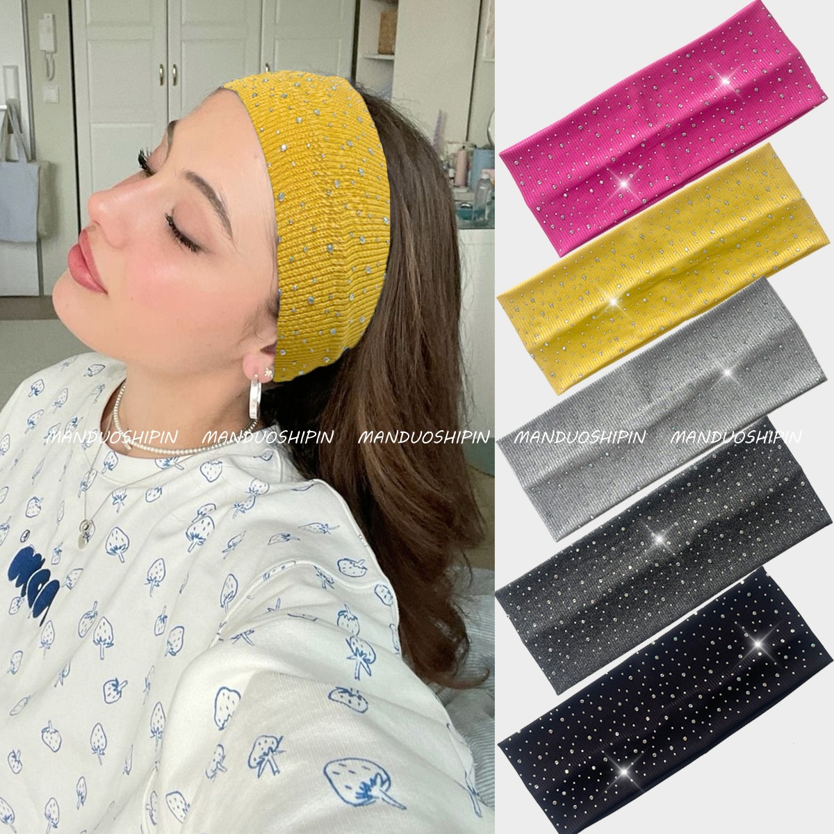 インターネットセレブの売れ筋ホットダイヤモンドソリッドカラーヘッドバンド、ファッショナブルな写真撮影用のつばの広い弾性ヘッドバンド、カラフルなダイヤモンドスタースポーツヘッドバンド、在庫あり