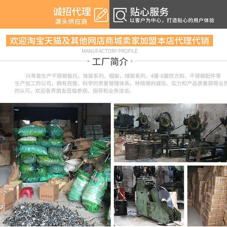 兴粤是专业生产不锈鋼板托、珠架系列、帽架,球架系列、4厘-6厘防方钩、不锈鋼配件等产品专业生产加工的公司,拥有完整、科学的质量管理体系。林晓珊的诚信、实力和产品质量获得业界的认可。欢迎各界朋友莅临参观、指导和业务洽谈。