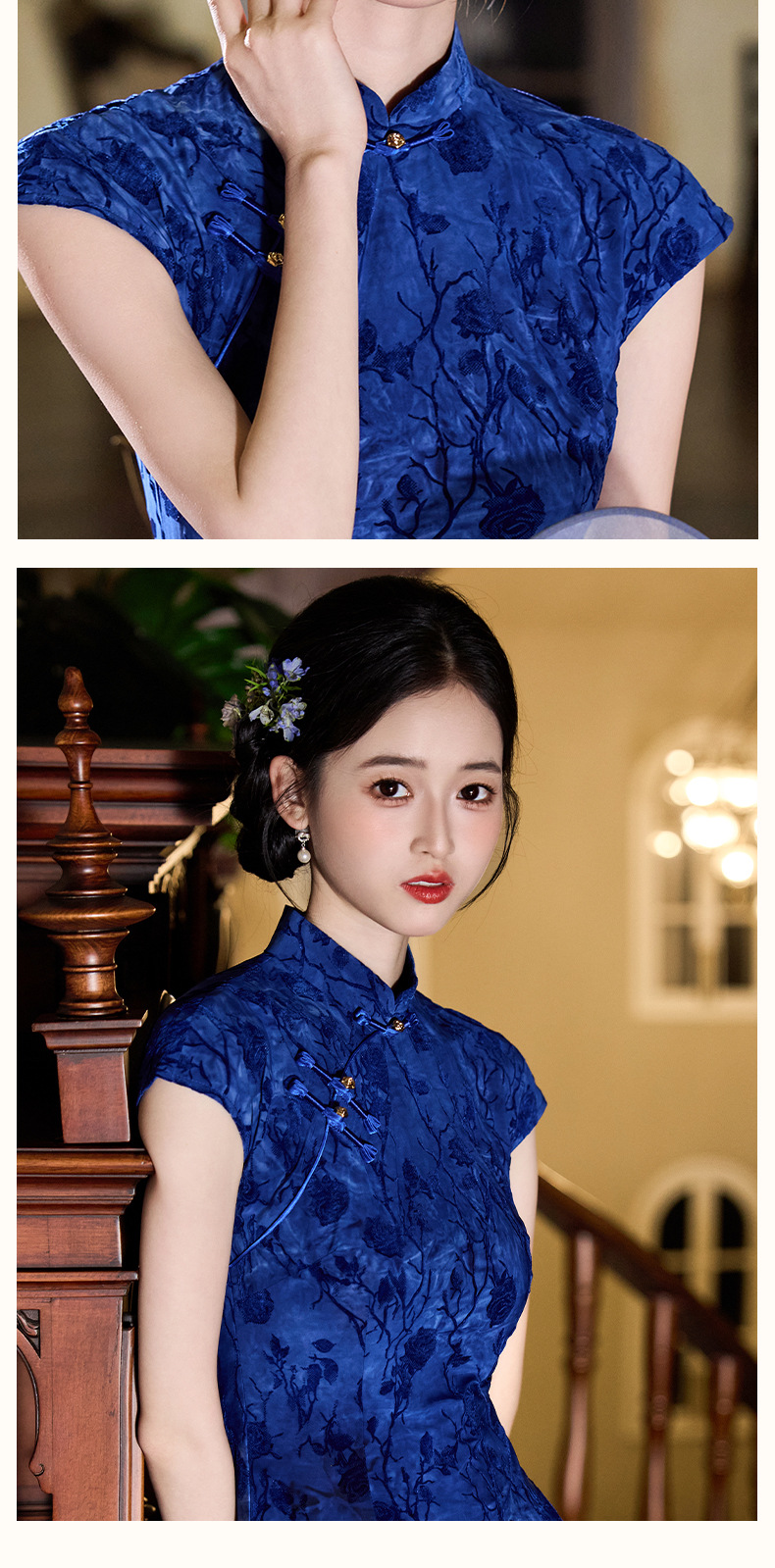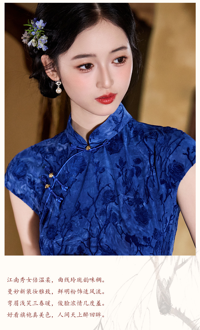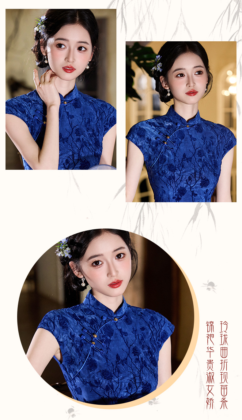 2025 新しい夏のチャイナドレスブルー高貴な気質エレガントなチャイナドレススタンドカラーノースリーブスリムフィットキャットウォークチャイナドレス