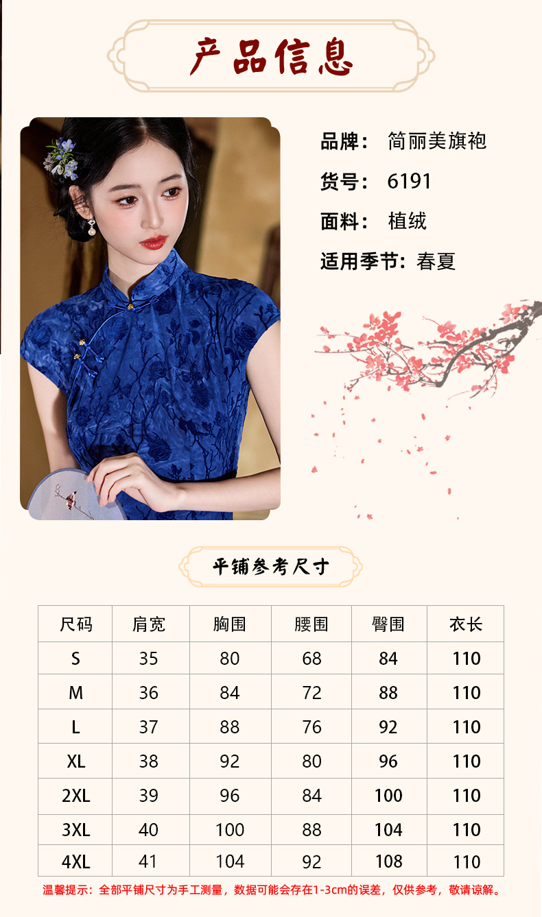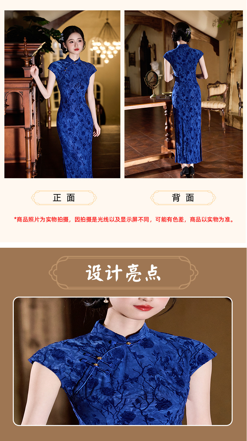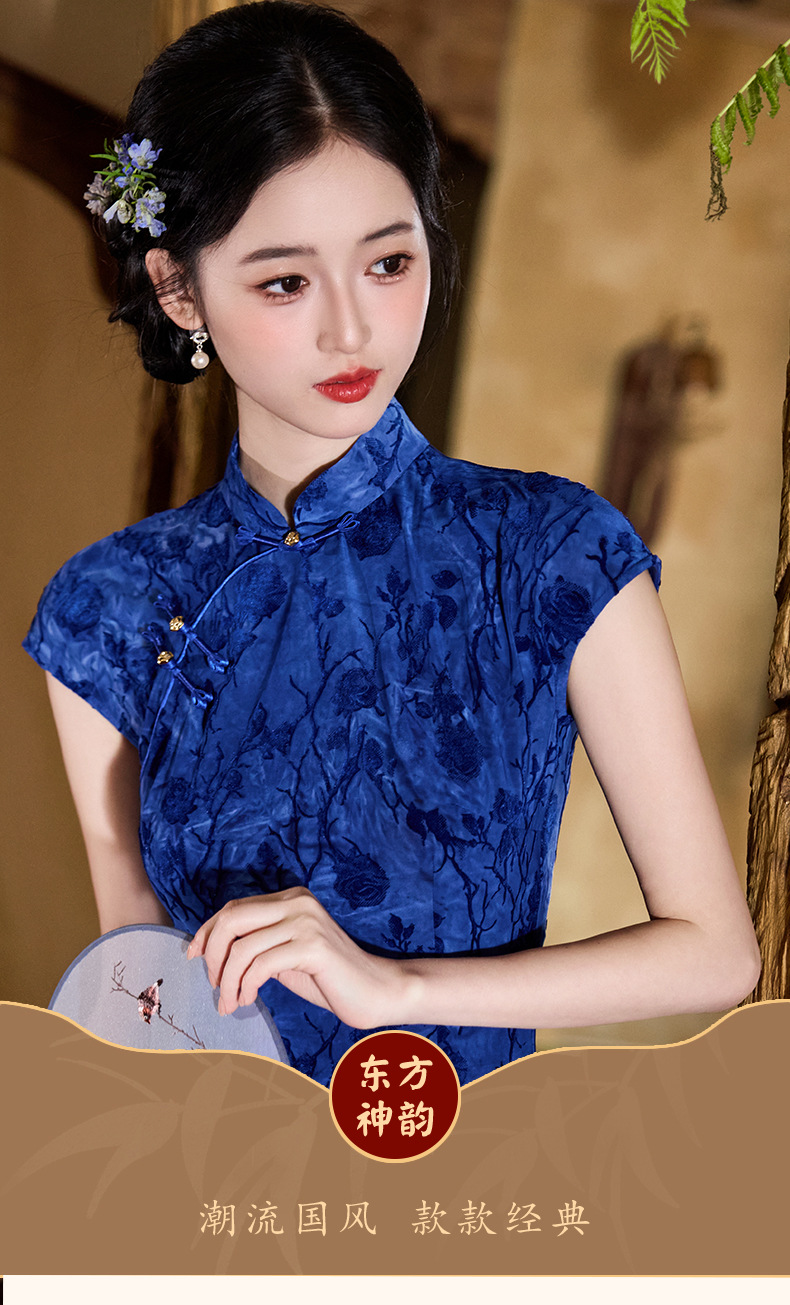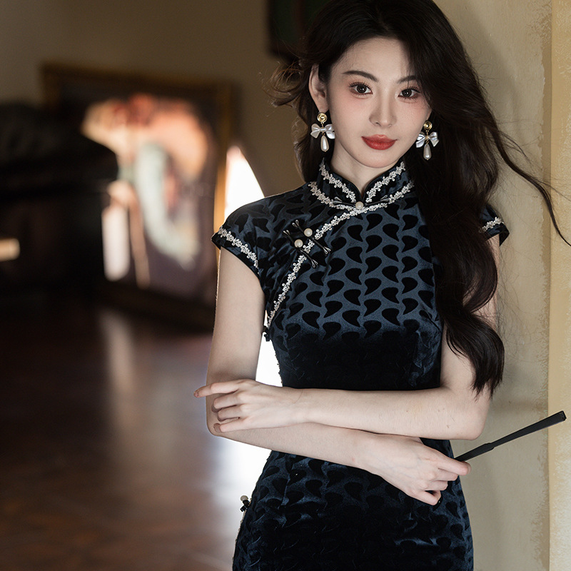 2025年新作夏のチャイナドレス植毛生地、新中国風の半袖ロースリットチャイナドレス、スリムで美しいチャイナドレス