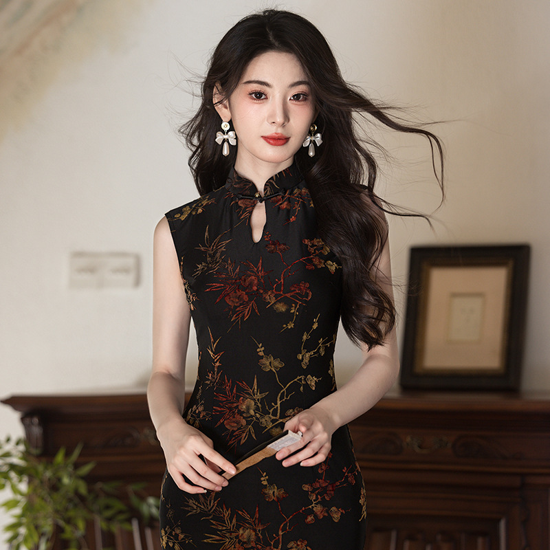 2025秋季新款旗袍黑色无袖旗袍新中式改良鱼尾连衣裙年轻款女旗袍