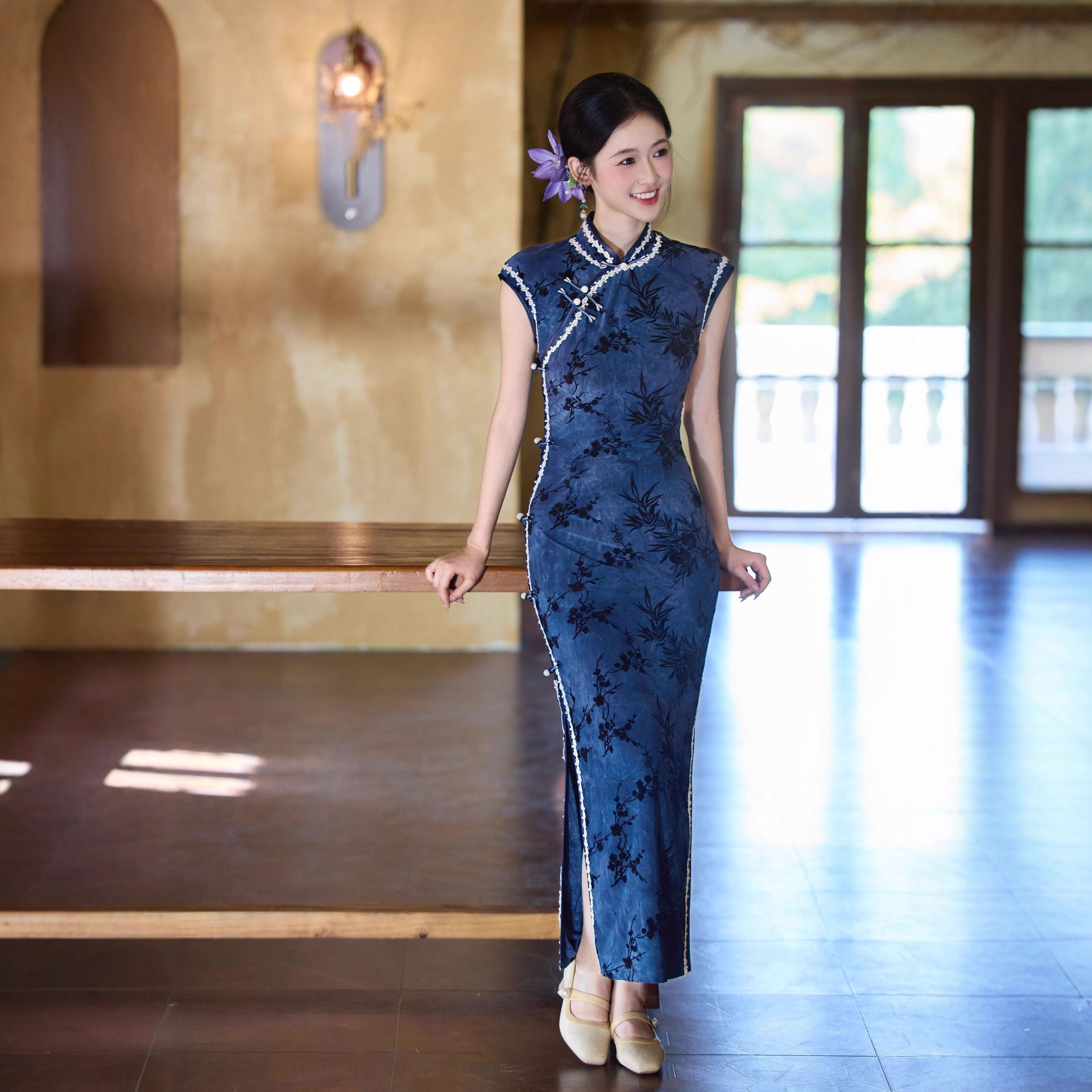 2025 新しい夏のチャイナドレスネイビーブルー古い上海中華民国スタイルのロングチャイナドレス改良された若いスタイルのチャイナドレス