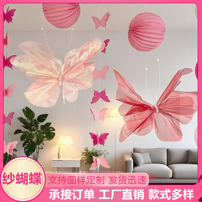 新款渐变蝴蝶婚庆舞台纱花派对布置橱窗摆设路引装饰幻彩纱蝴蝶