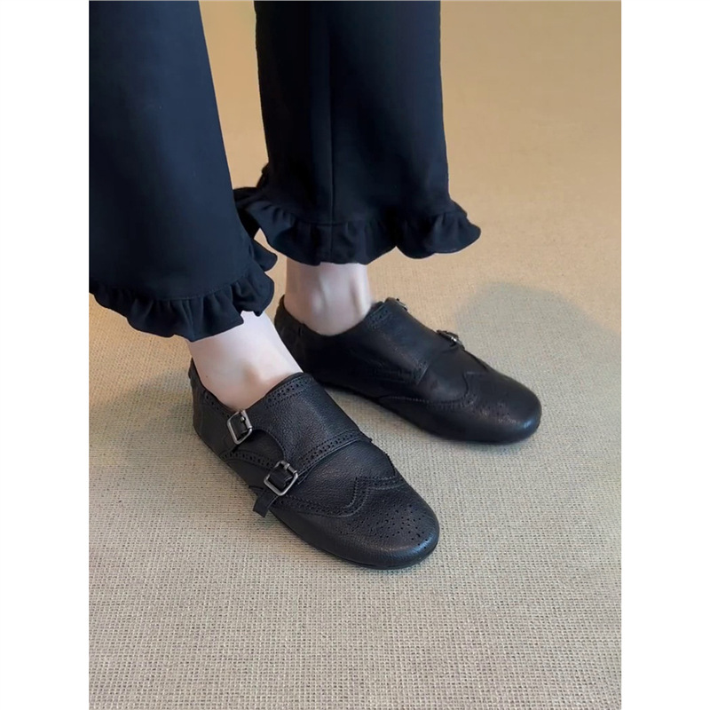 牛皮版~复古布洛克雕花一脚蹬乐福鞋百搭通勤平底单鞋英伦小皮鞋