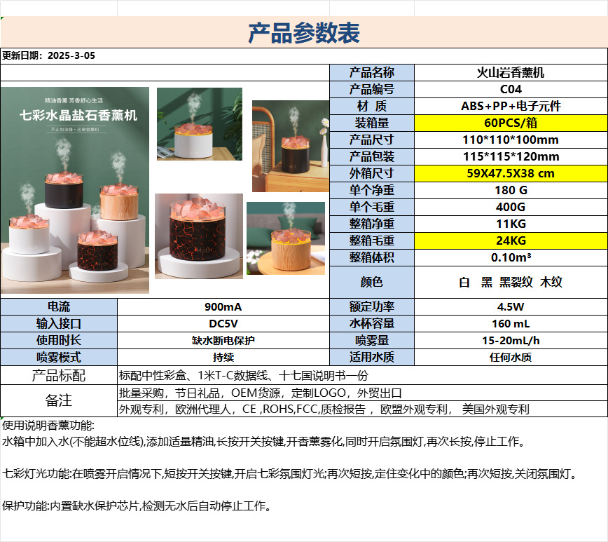 製品仕様 ソルトストーンアンビエントライトアロマセラピーマシン