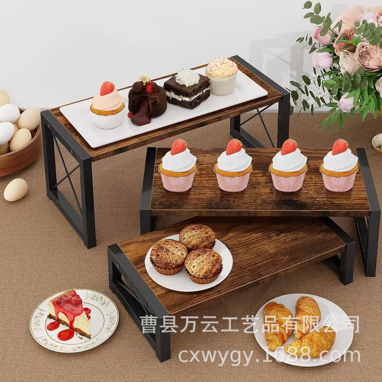 ヨーロッパスタイルの鉄と木材の組み合わせスナックディスプレイスタンド、クワッドパーティーケーキスナックスタンド、段付き木製手作りおもちゃスタンド