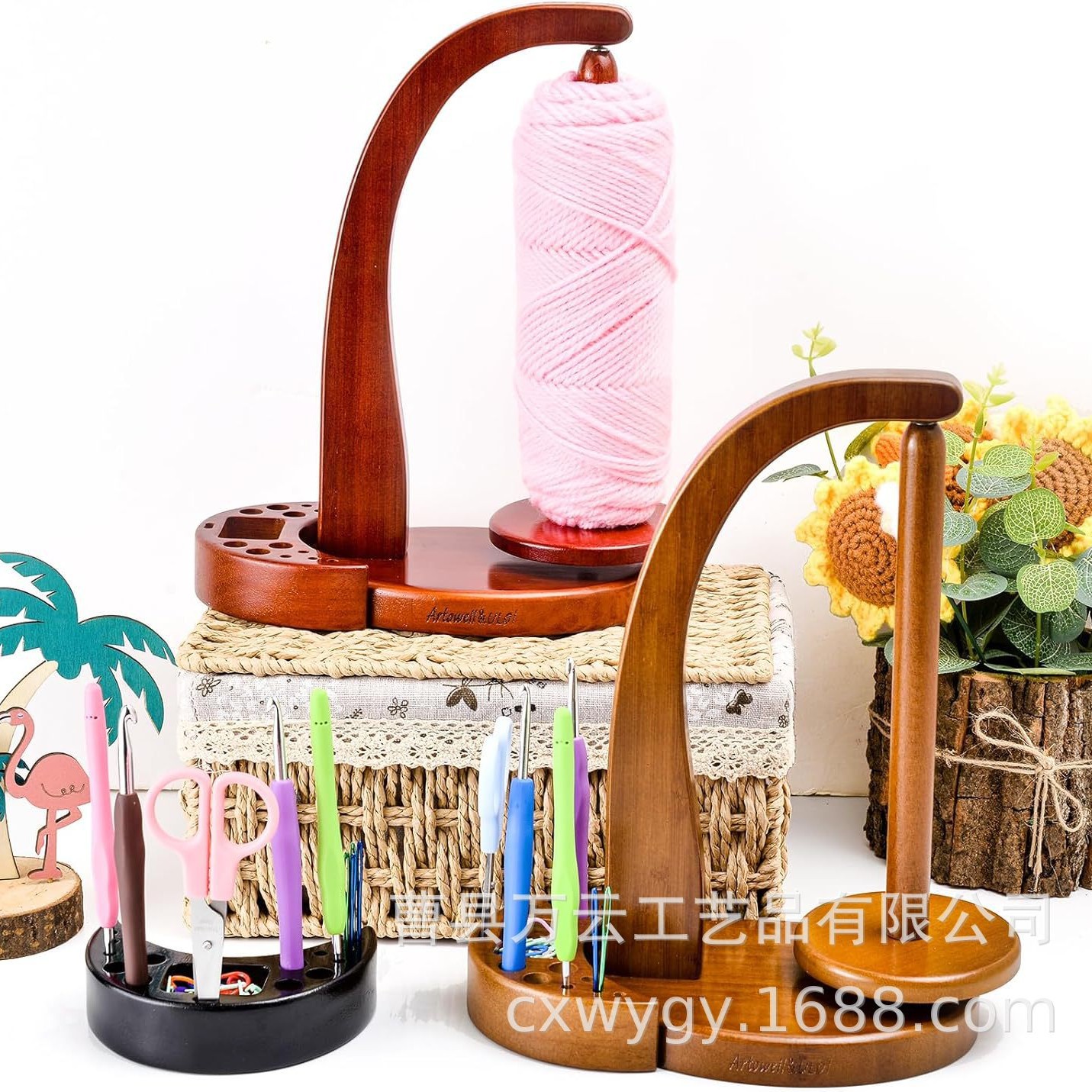 跨境木质毛线轴架可旋转绕线架多功能带手机底座毛线球收纳架
