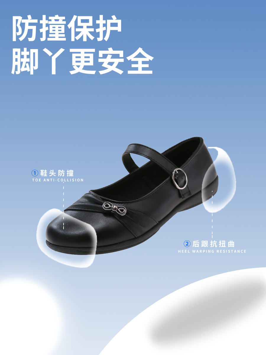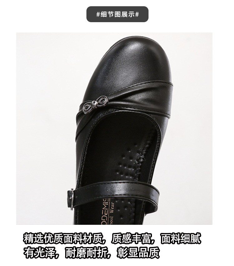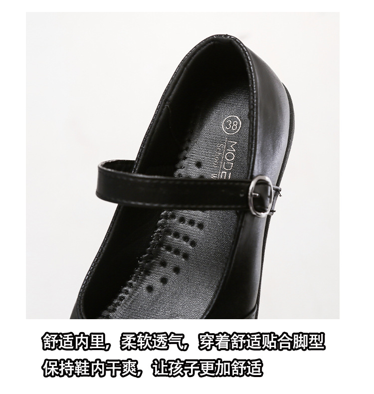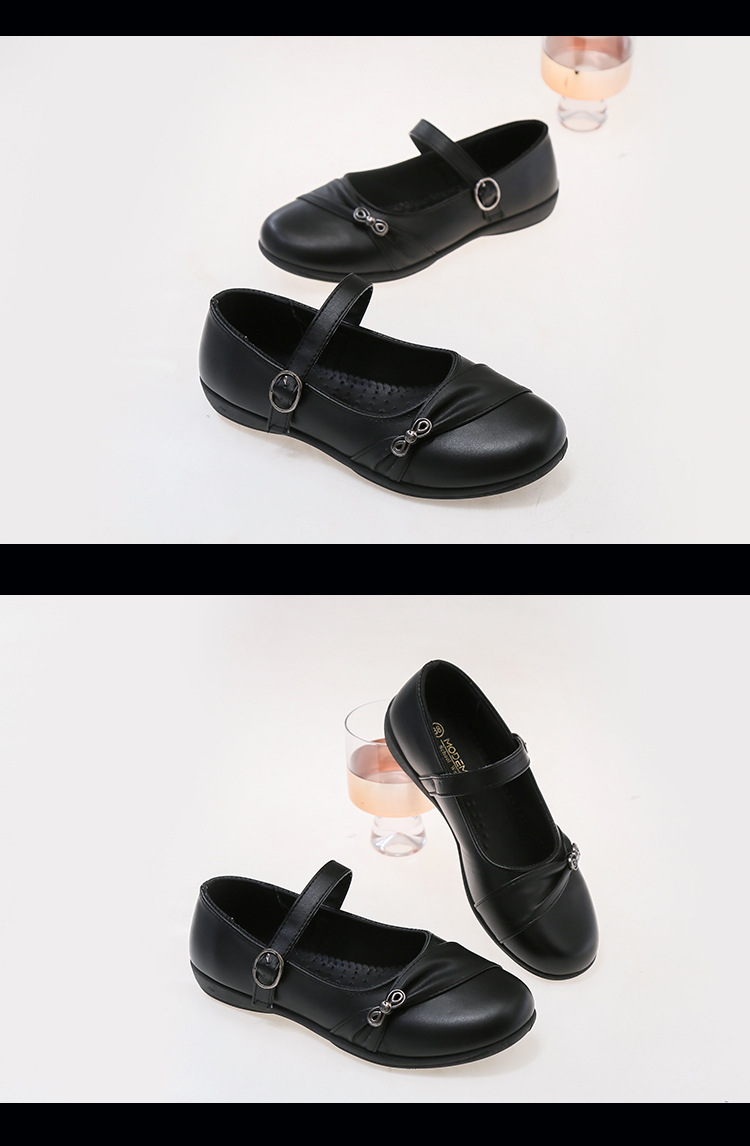 女性の黒革靴、おばあちゃんの靴、スクエアマウス学生パフォーマンスシューズ、ワンラインバックル、中型および大型の子供用ドレスシューズ、滑り止めフラットレザーシューズ
