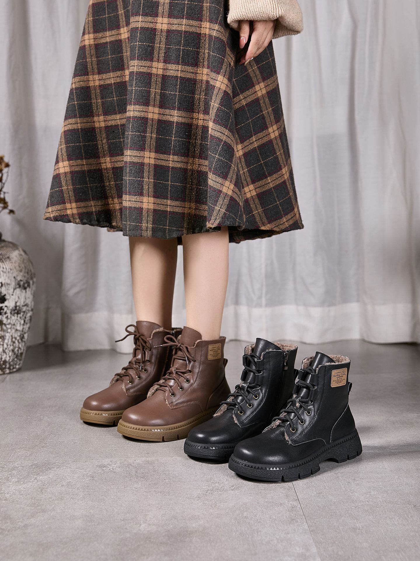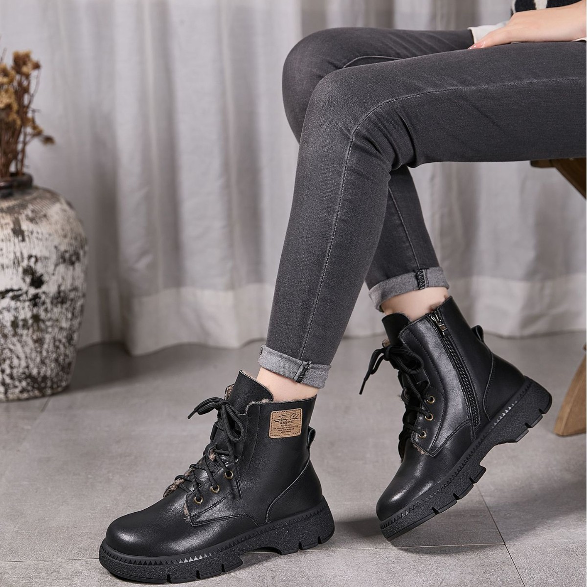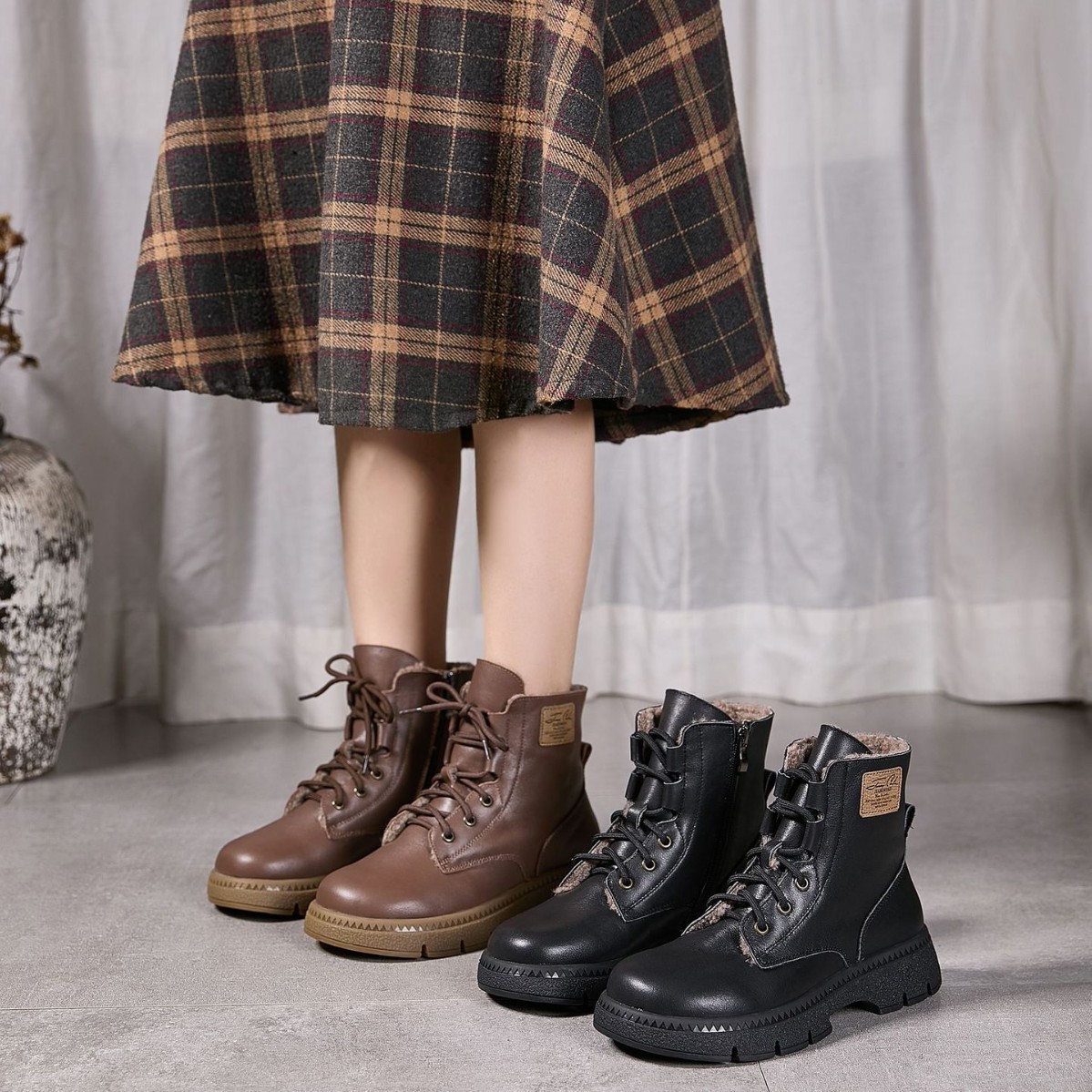 手作り厚底本革レディースショートブーツマーティンブーツレトロ文学ラウンドトゥレースアップサイドジッパー牛革レディースレザーブーツ