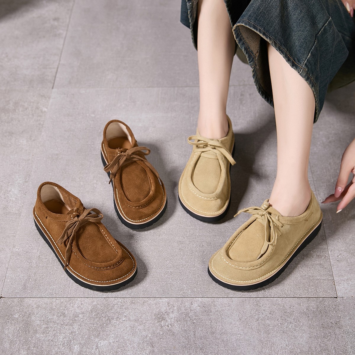 一層牛革製レディースシューズ2025新作、紐付きハイヒール、柔らかい革、柔らかい底、カジュアルシューズ、フラット、大きめつま先、可愛いローヒール