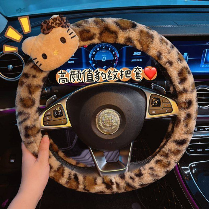 かわいい車のステアリングホイールカバー冬豪華な暖かい滑り止めヒョウ柄猫ハンドルバーカバー女性のための 2025 新しい装飾