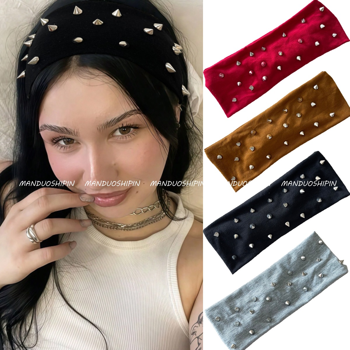 跨境新款朋克风发带纯色铆钉复古头饰宽边弹力高级感时尚束发带女
