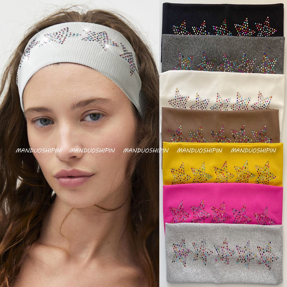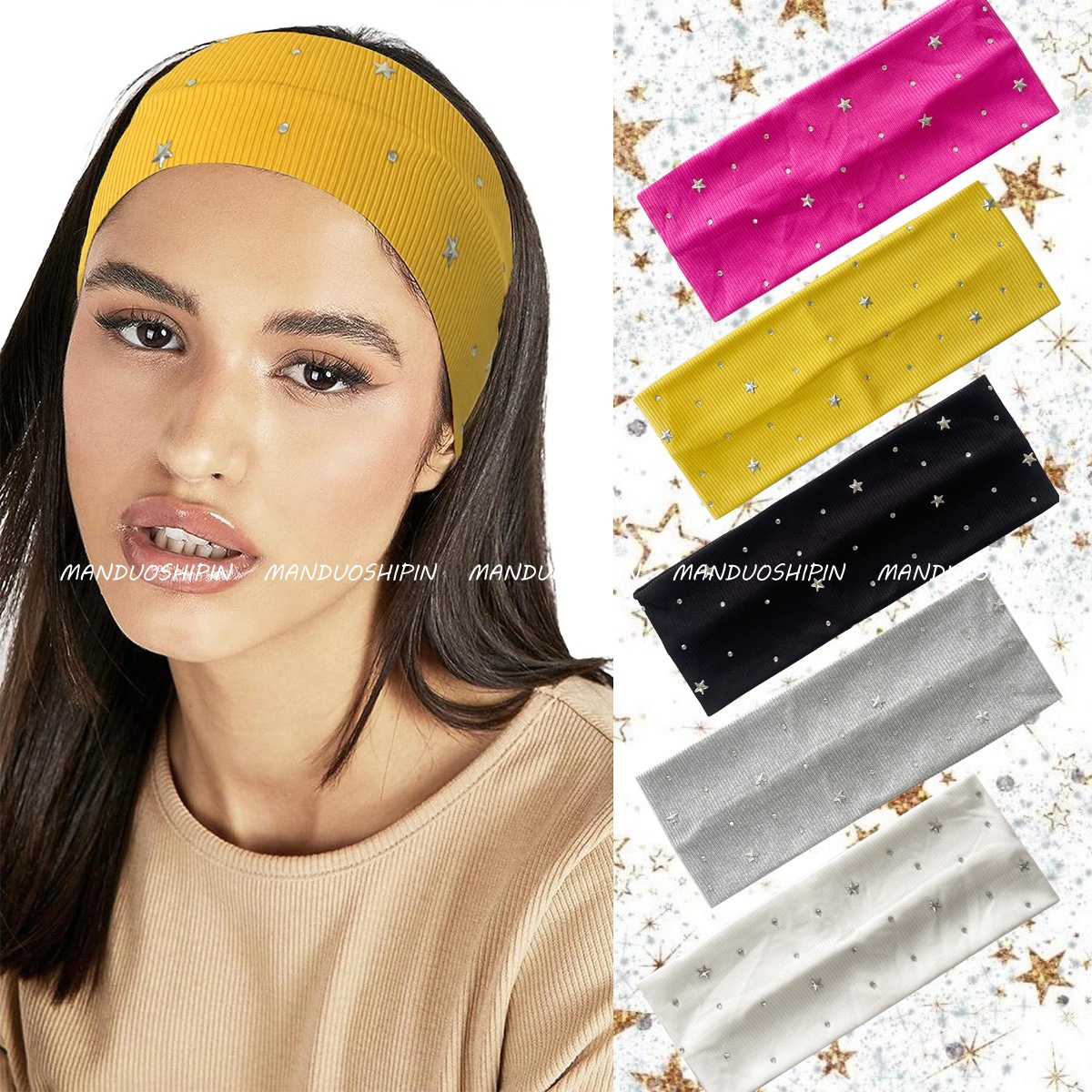 Amazon クロスボーダーレトロソリッドカラーホットダイヤモンドヘッドバンドカラフルな五芒星ファッション写真アクセサリーつば広弾性ヘッドバンド