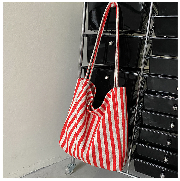 ฿韓国スタイルカジュアルハンドバッグ大容量ストライプキャンバスショルダー収納レディースファッションスーパーマーケットショッピングバッグ卸売