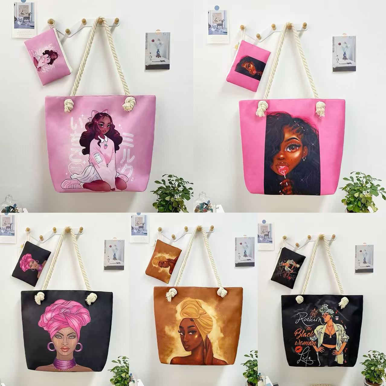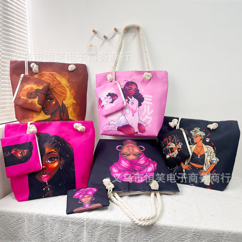 クロスボーダー風百合特バッグ女性式携帯ショッピングバッグ創意女性プリント太縄バッグ黒美人現物タイプ