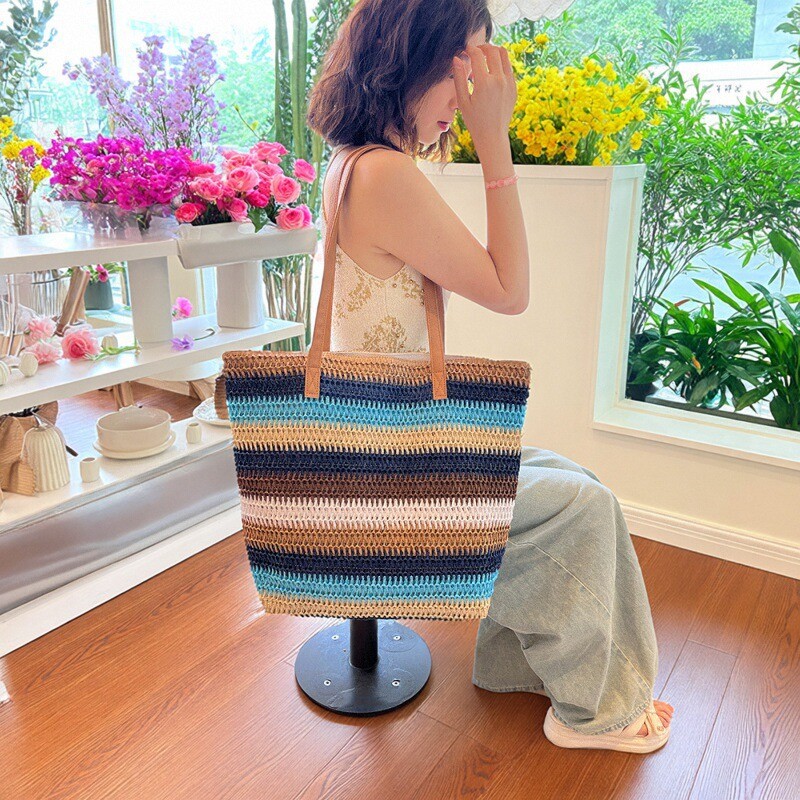 クロスボーダーレインボーストライプコントラストトートバッグPP織りわらショルダーバッグ多用途海辺休暇ビーチバッグ卸売