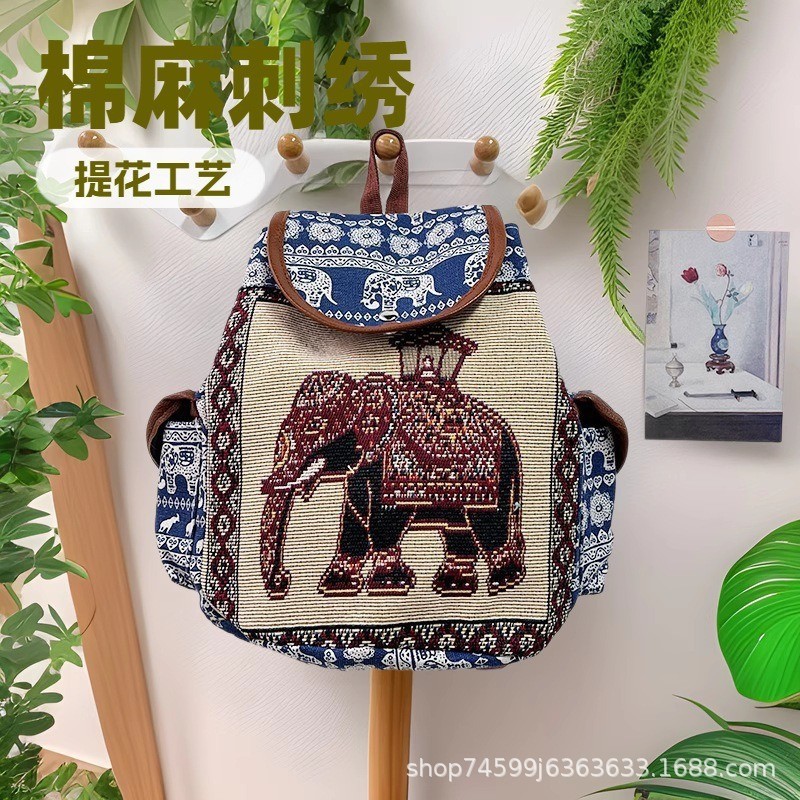 クロスボーダーレトロエスニックスタイルバックパック巾着バックル巾着キャンバス象刺繍フリップジッパーレディースバックパック