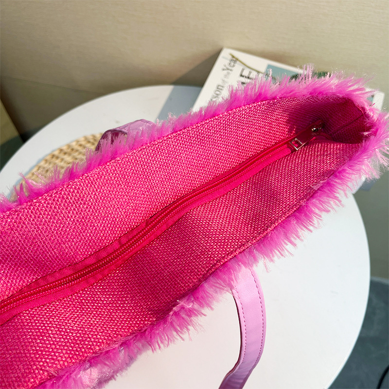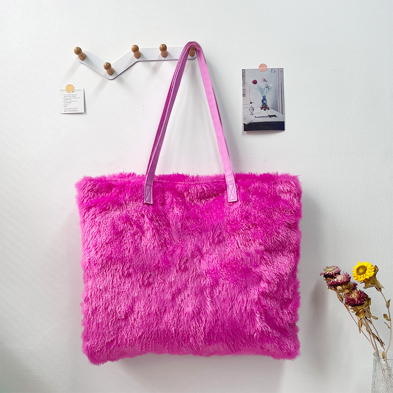 2025年欧米風ファッションイミテーションラビットファーハンドバッグ、ショルダーバッグ、トートバッグ、男女兼用、大きめ、黒とピンク