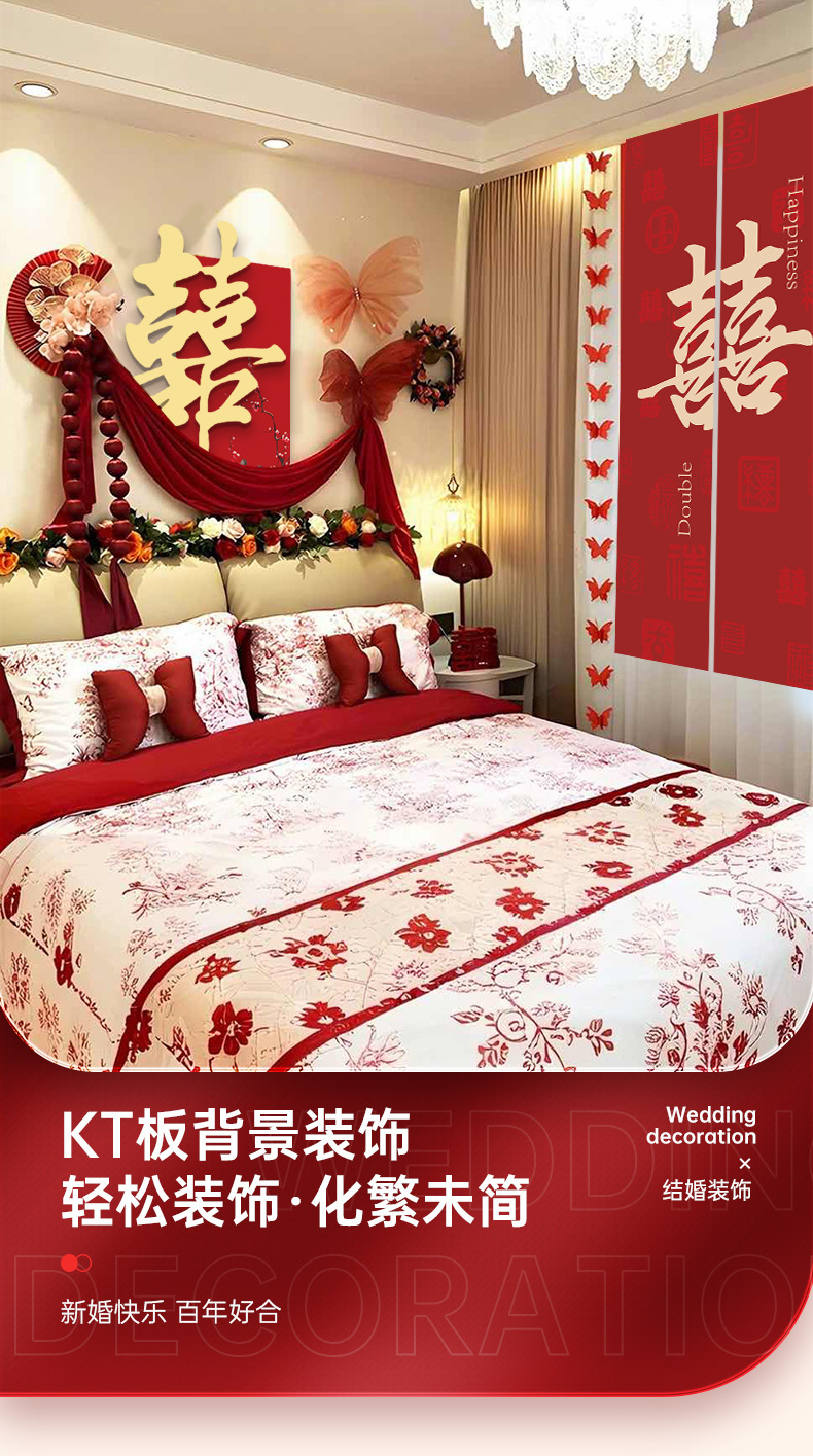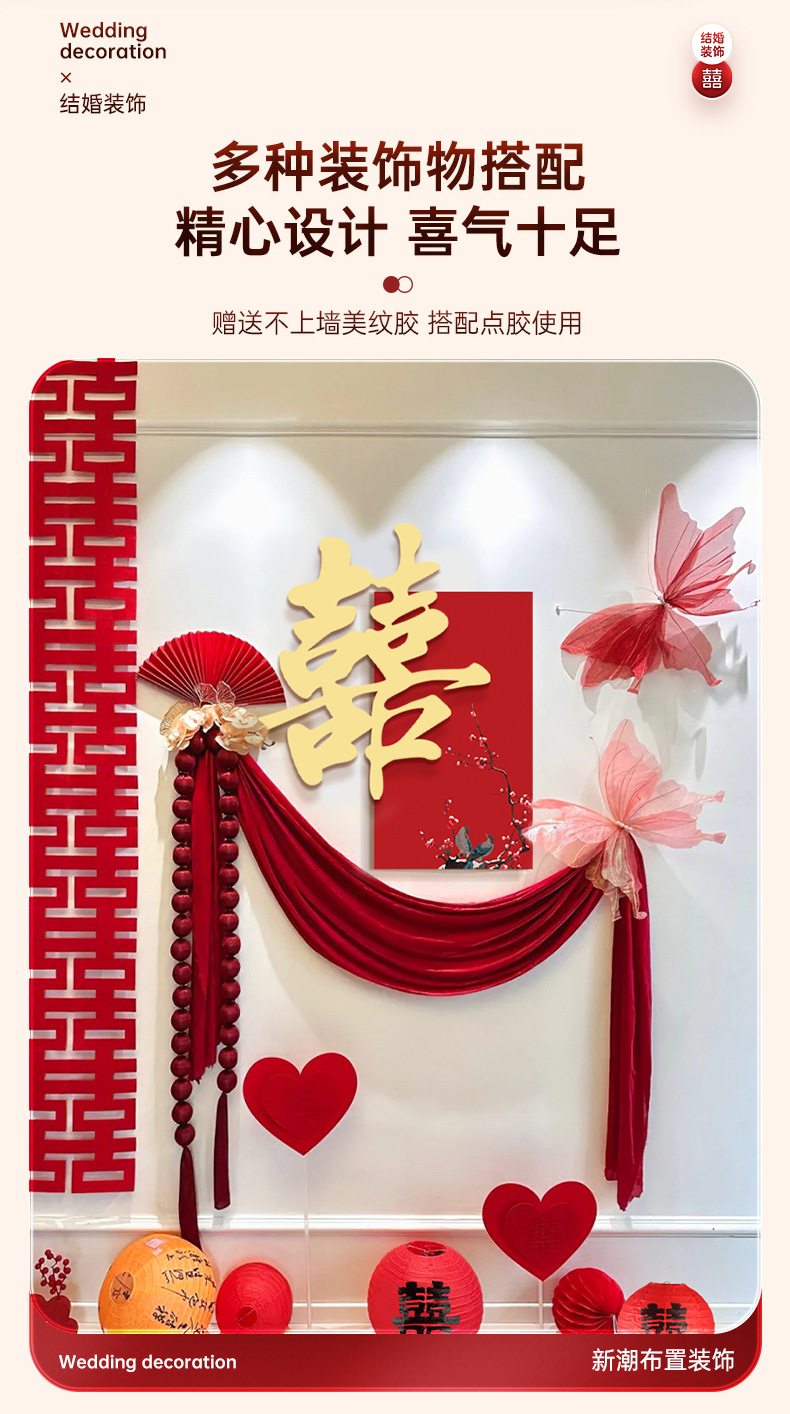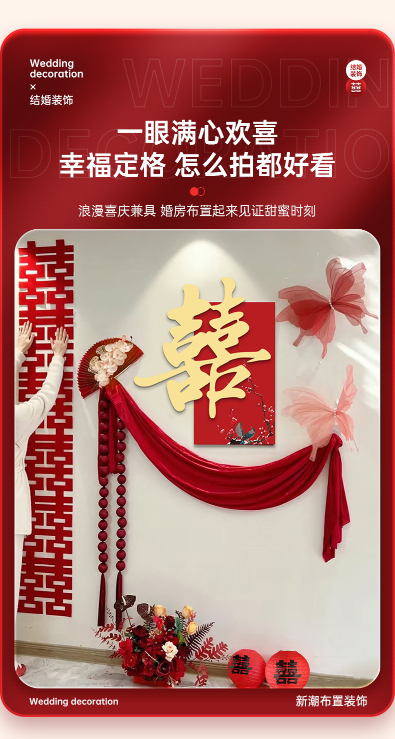 ウェディングルームの配置セットの結婚式専用2025新型女性の寝室の男性の客間の喜字の背景の壁の装飾