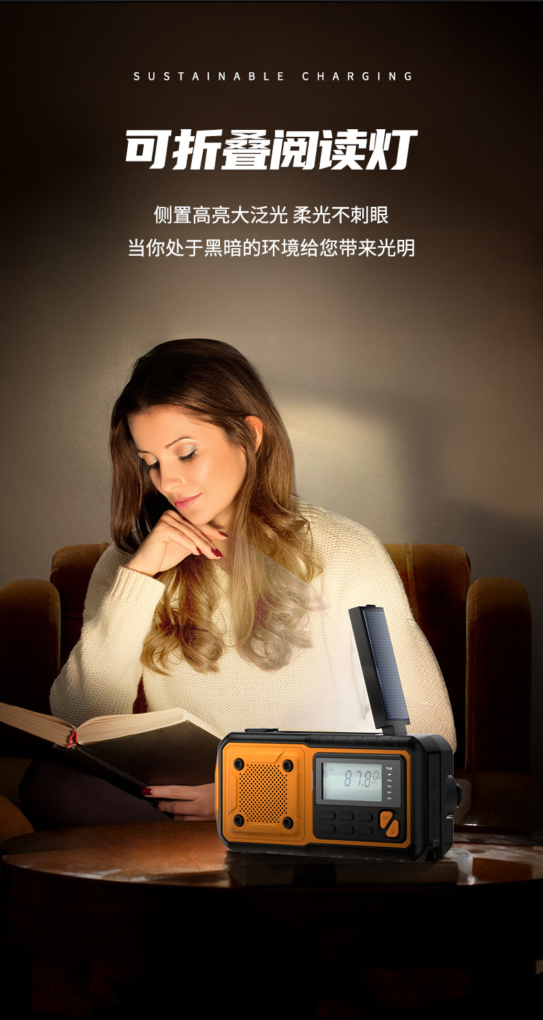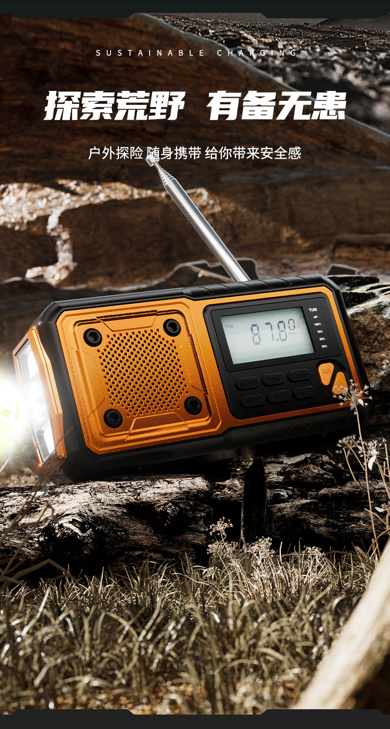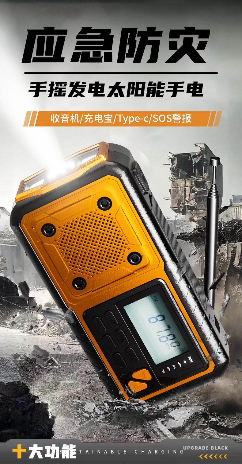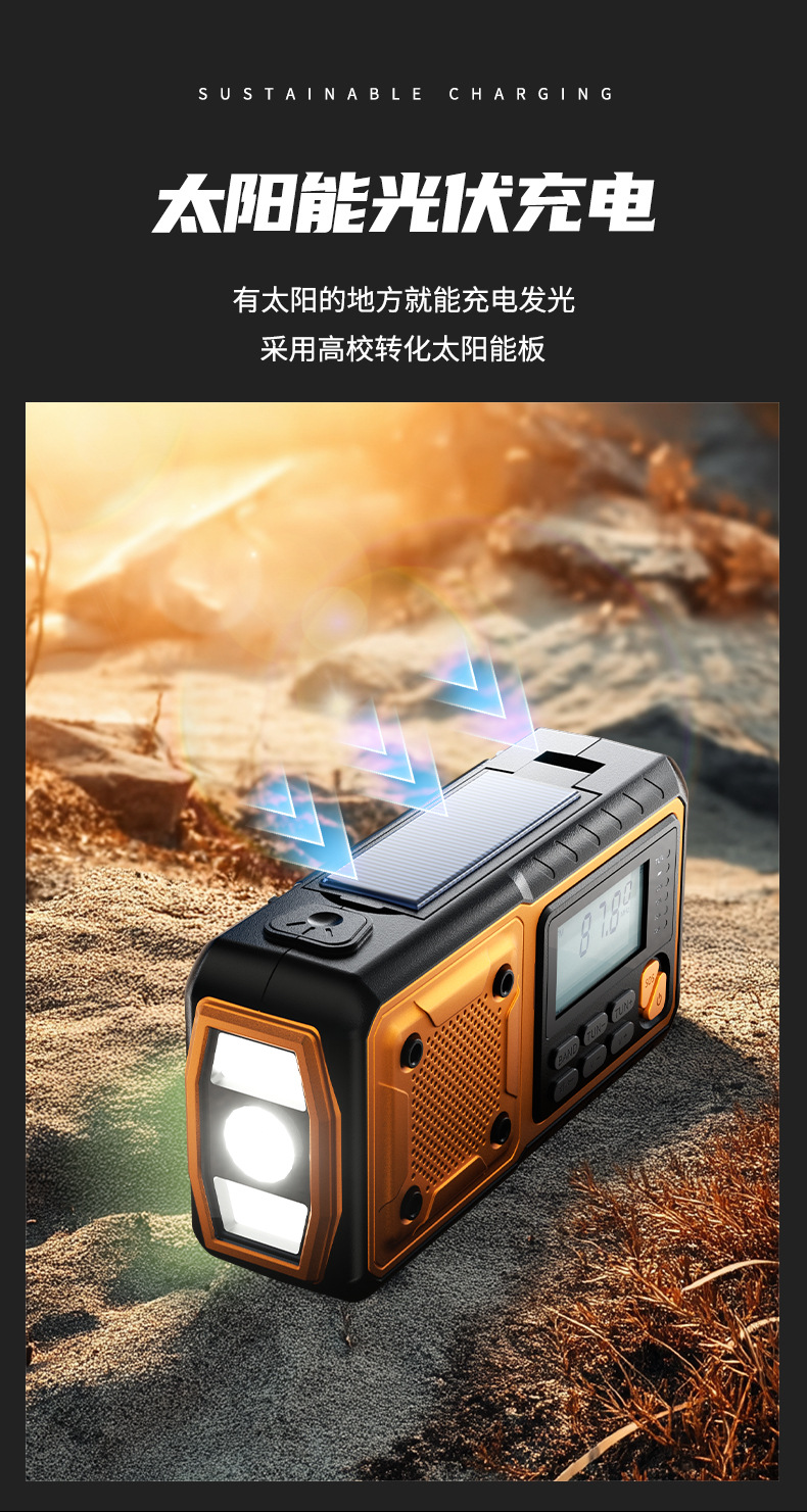 クロスボーダー多機能アウトドア緊急太陽光手回し発電ラジオ防災読書灯懐中電灯充電宝