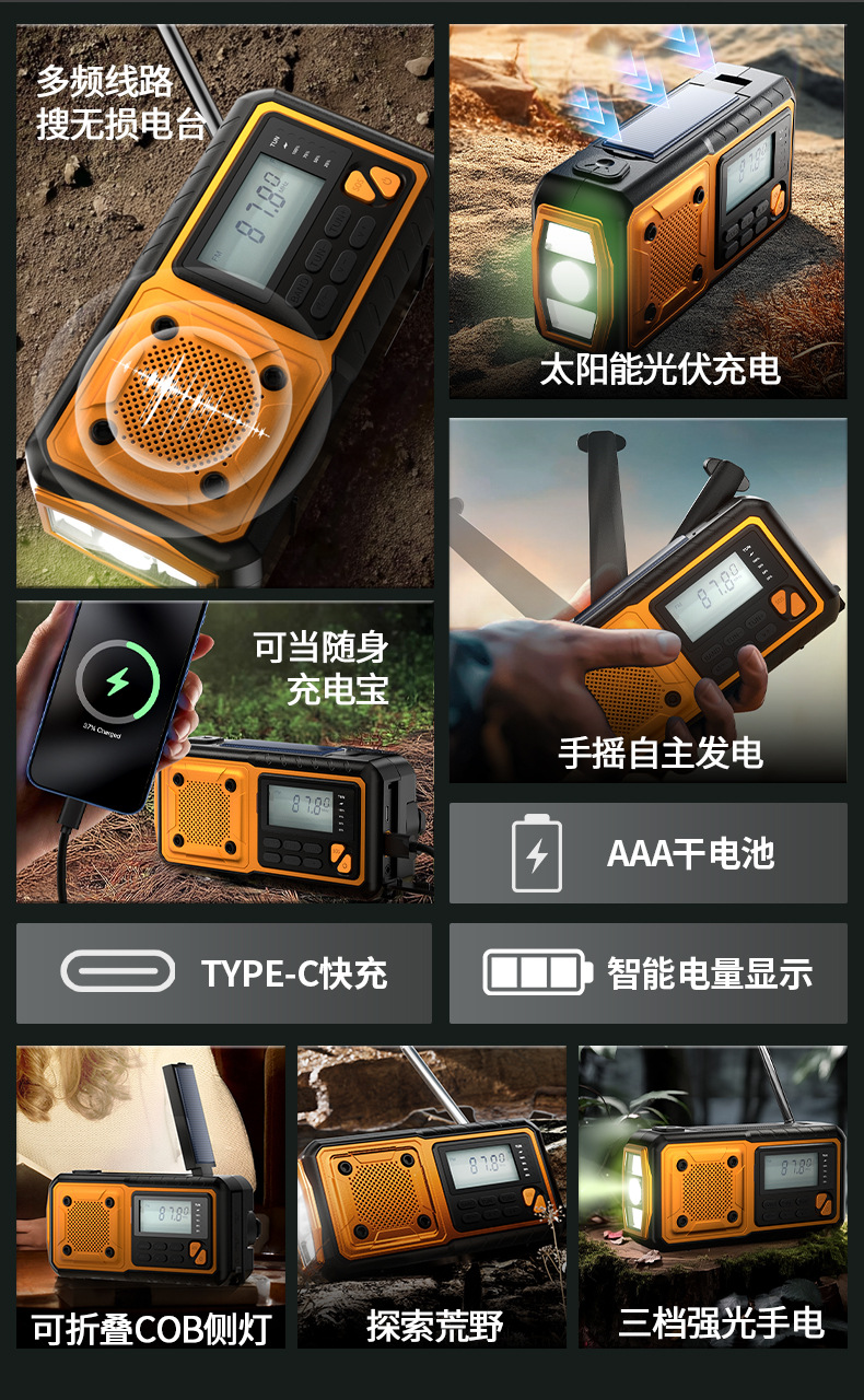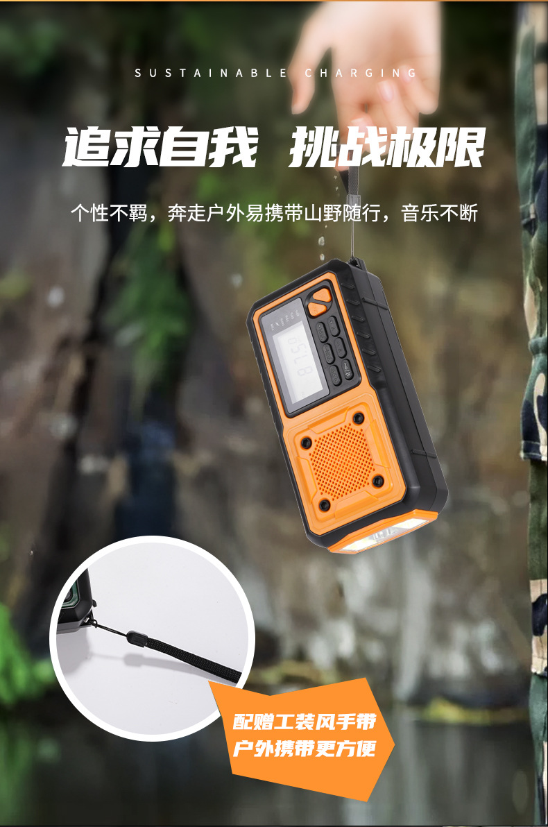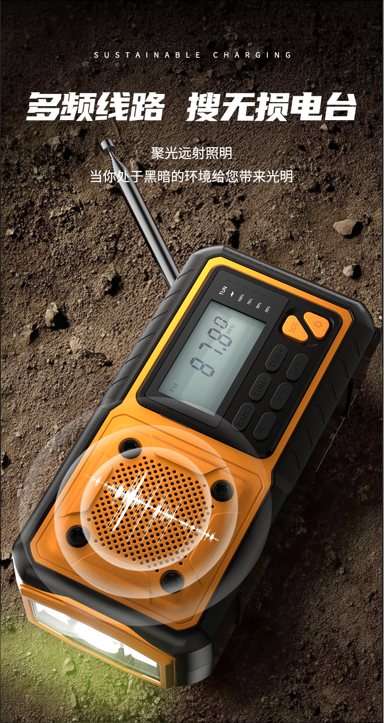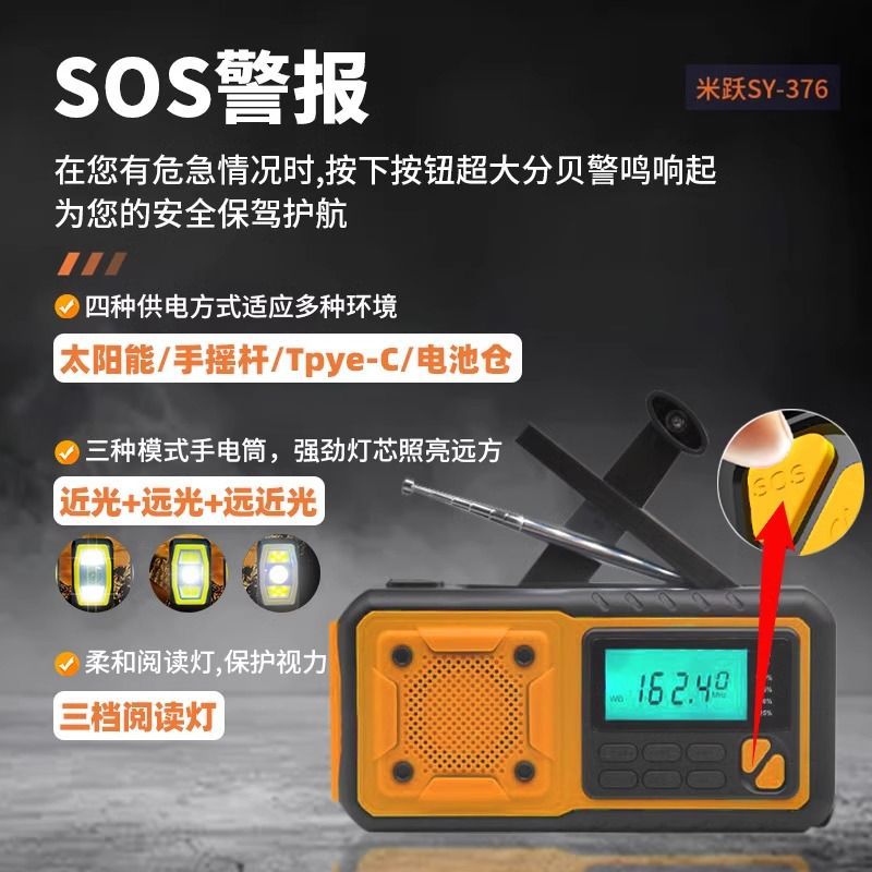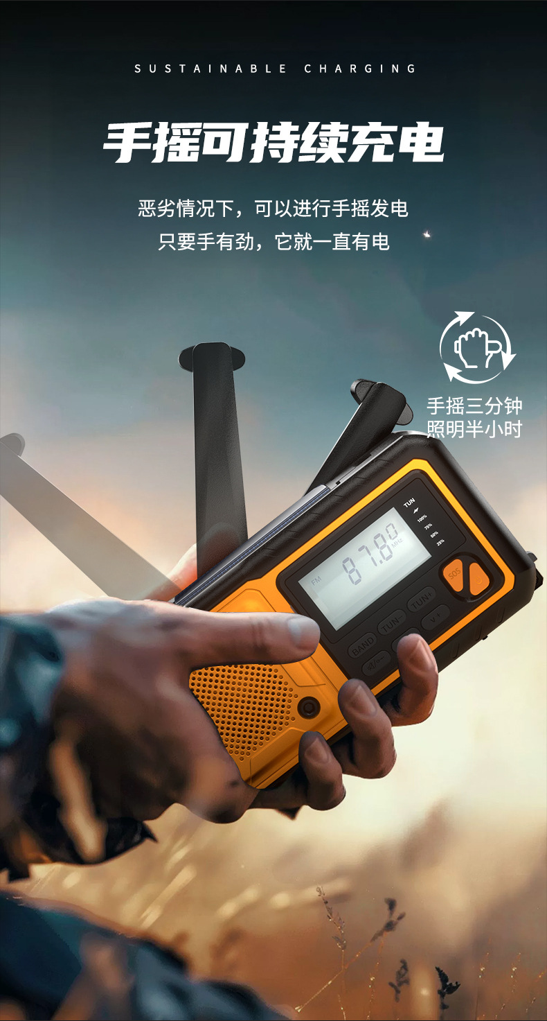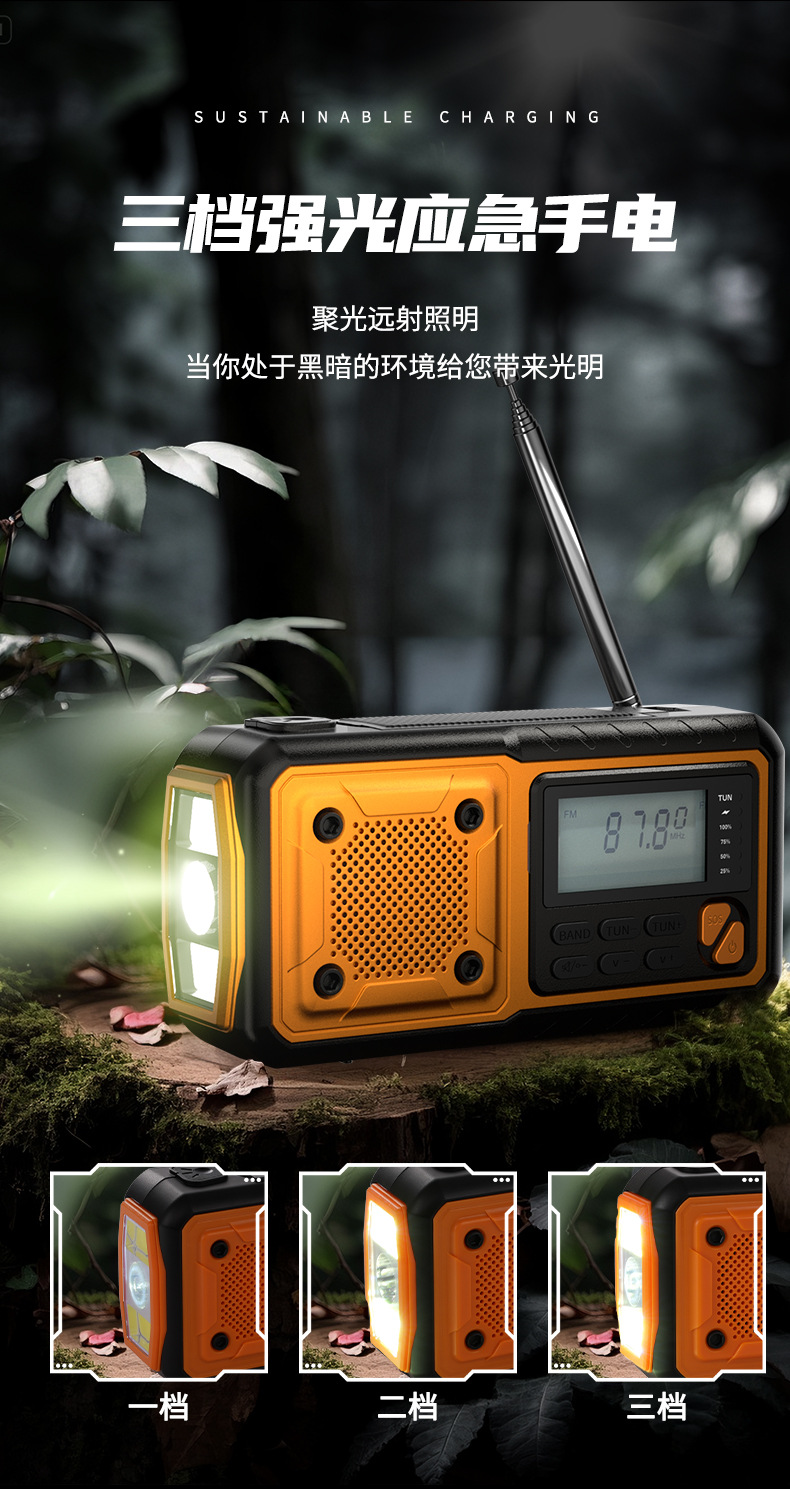 クロスボーダー多機能アウトドア緊急太陽光手回し発電ラジオ防災読書灯懐中電灯充電宝