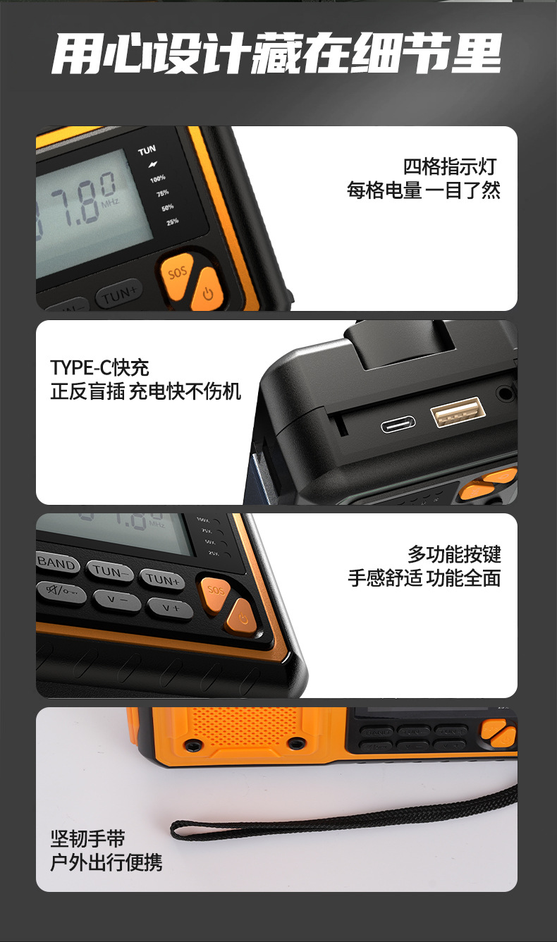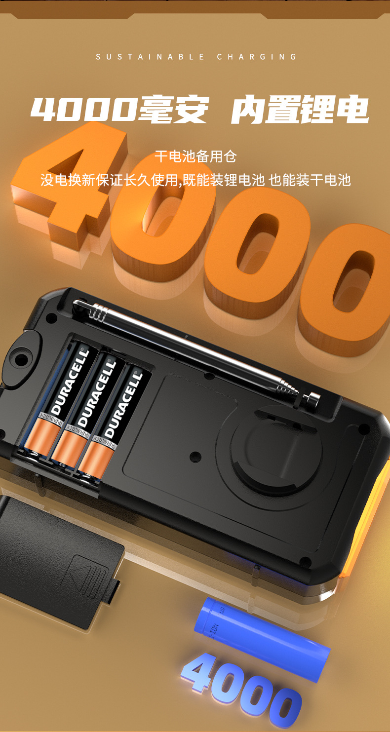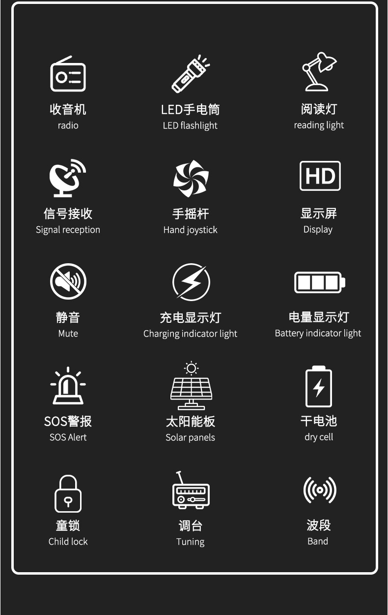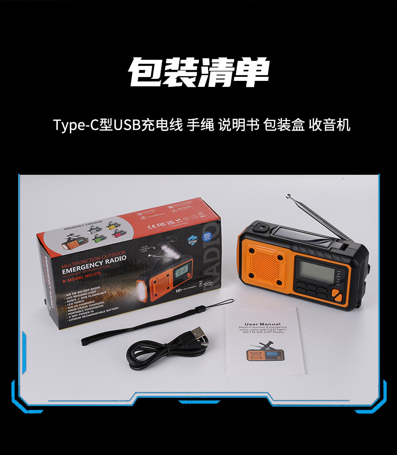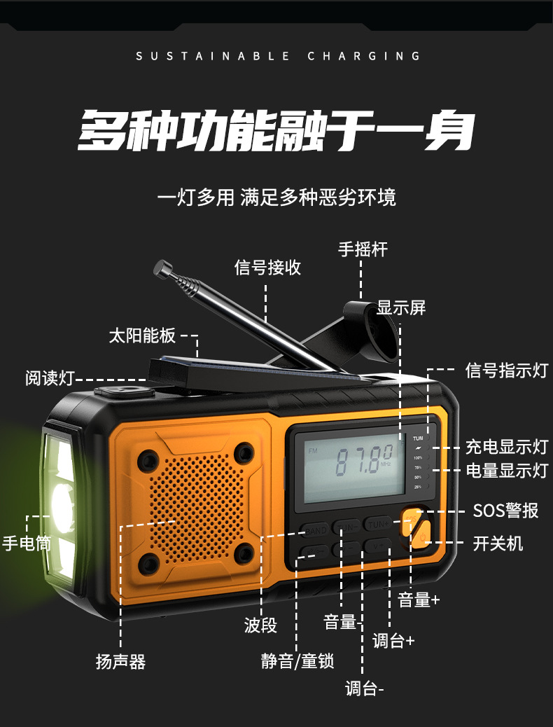 クロスボーダー多機能アウトドア緊急太陽光手回し発電ラジオ防災読書灯懐中電灯充電宝