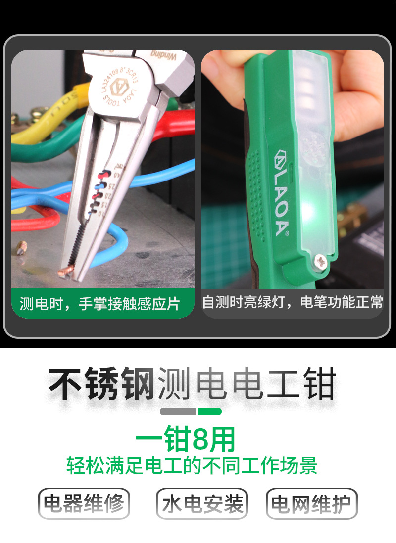 8合1不锈钢剥线尖嘴钳防滑多功能剥线器带测电笔剥线器电工钳