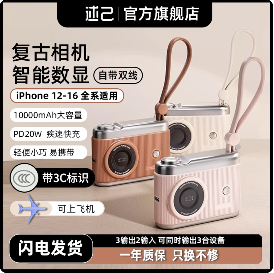 CE認証取得済み レトロ風クリエイティブミニカメラモバイルバッテリー 10000mAh 内蔵ケーブル急速充電22.5W