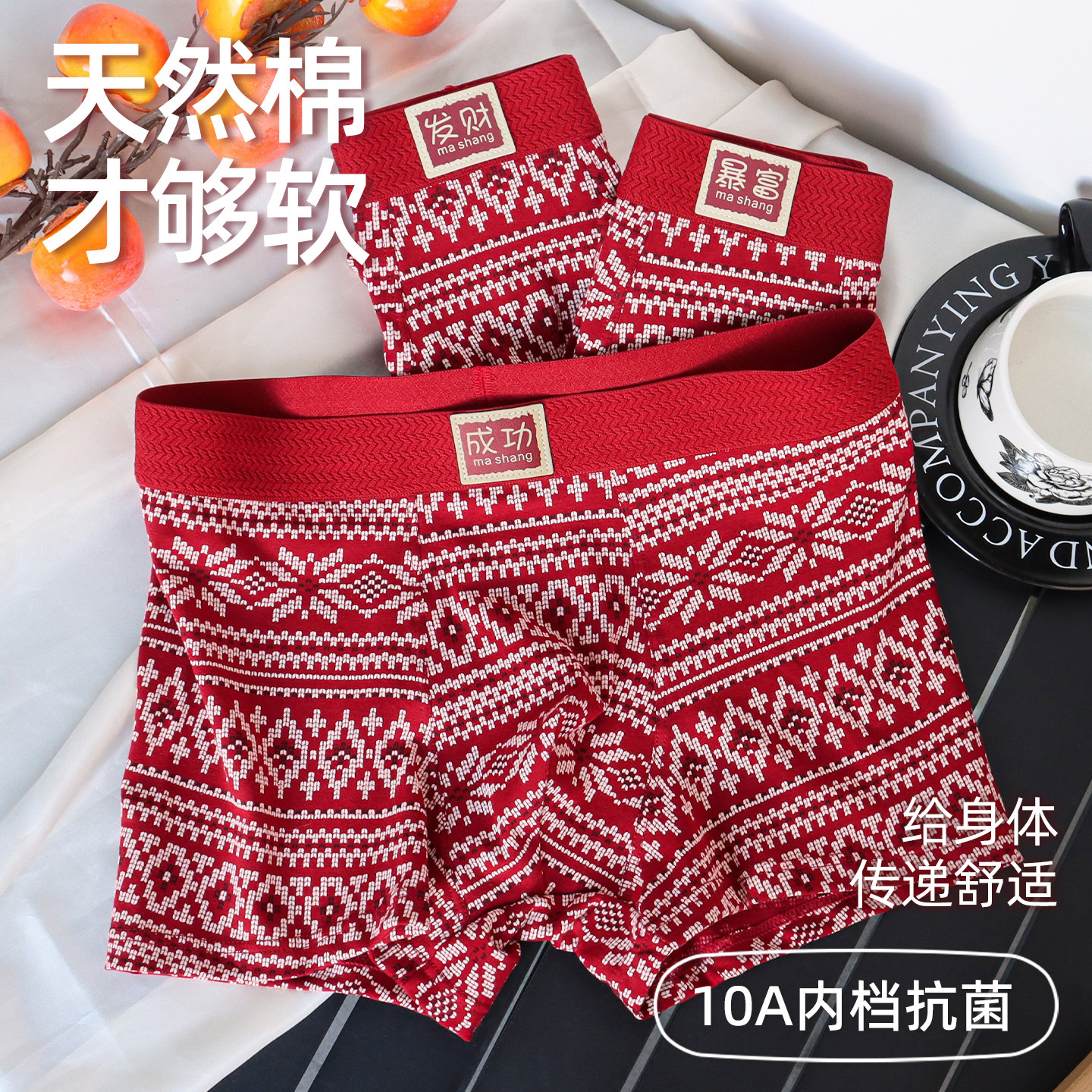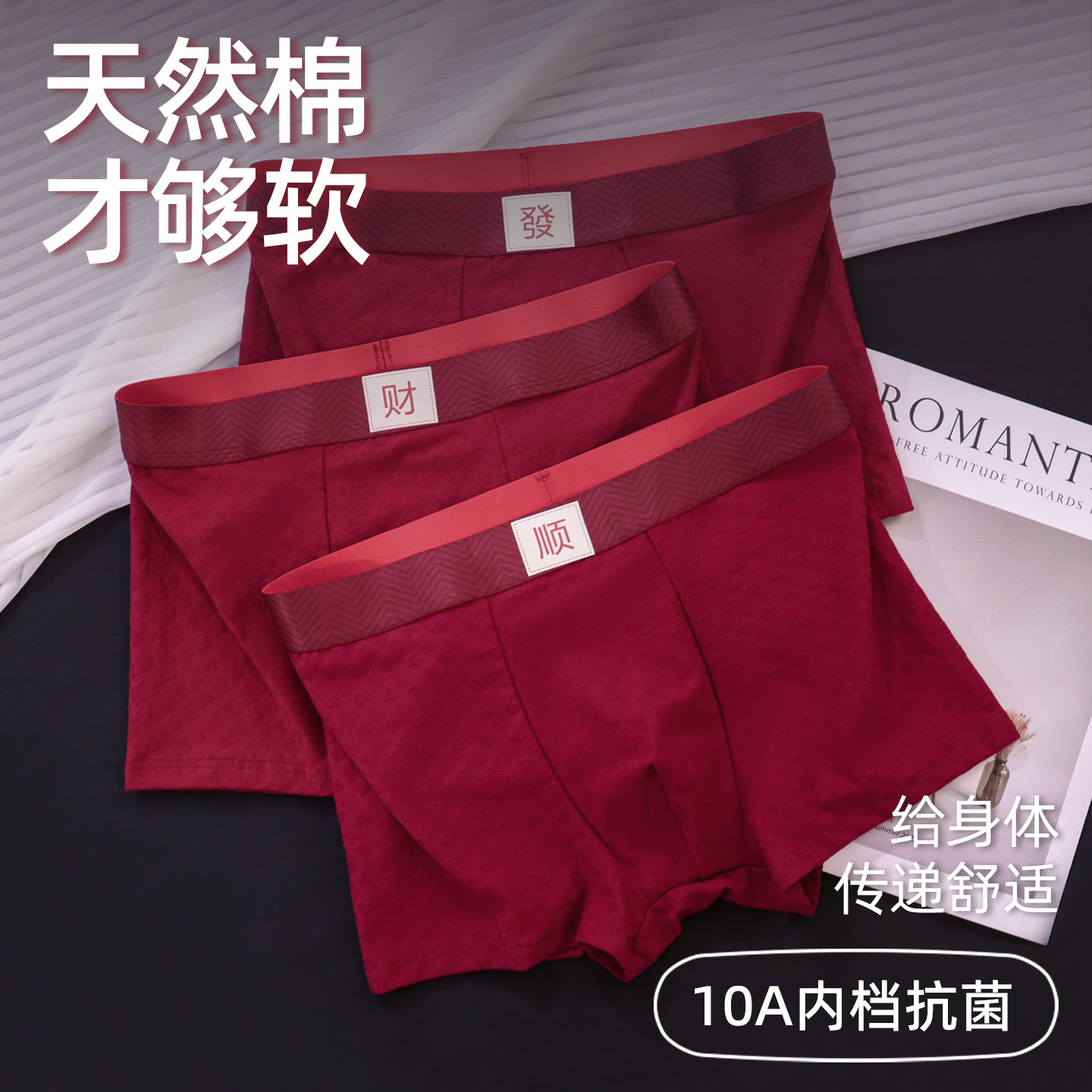 10A抑菌提花酒红色内裤本命年平角裤透气纯棉四角裤结婚喜庆礼物