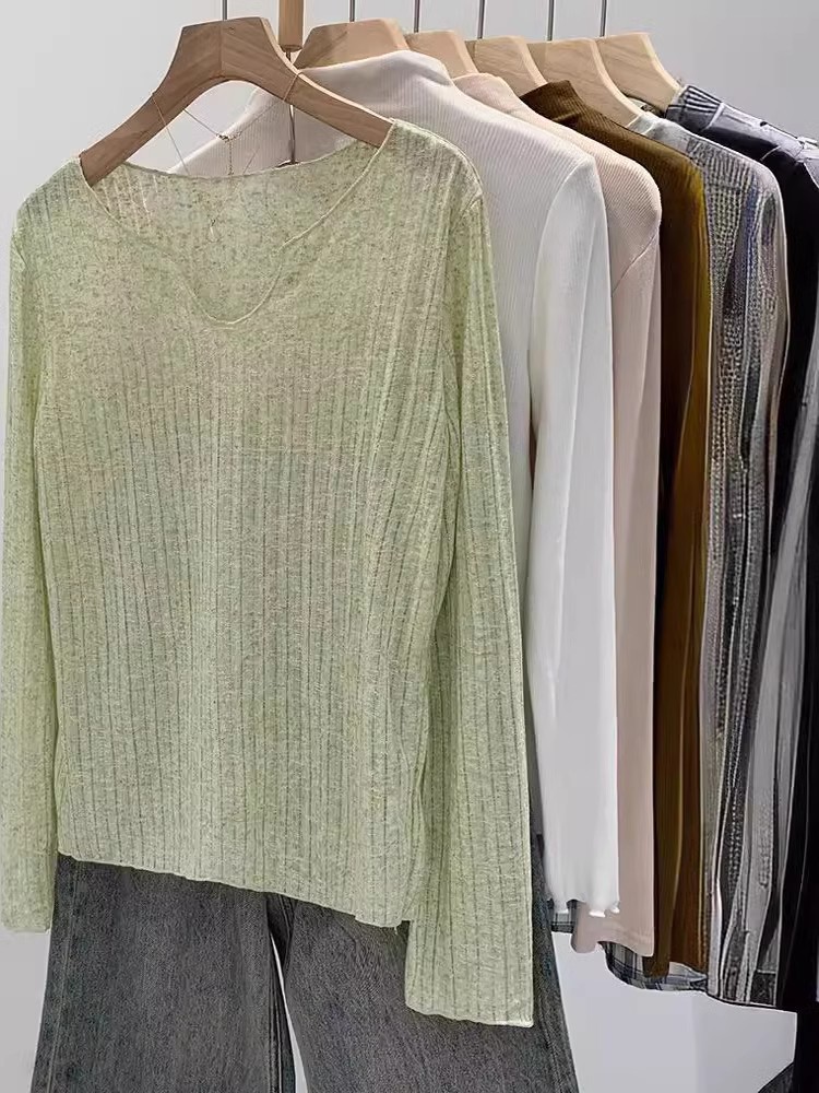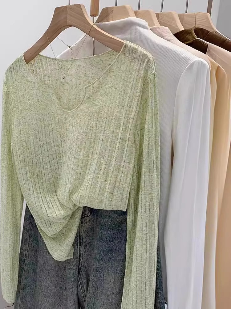 【原版布料】 早春季法式微透木耳边V领长袖女薄款防晒罩衫宽松T