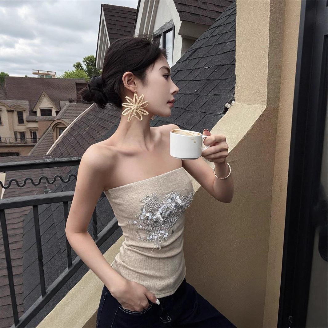 スリムフレンチデザイン春夏ニッチ胸巻きストラップレス2025バックレス新作レースアップベストレディースチューブトップ