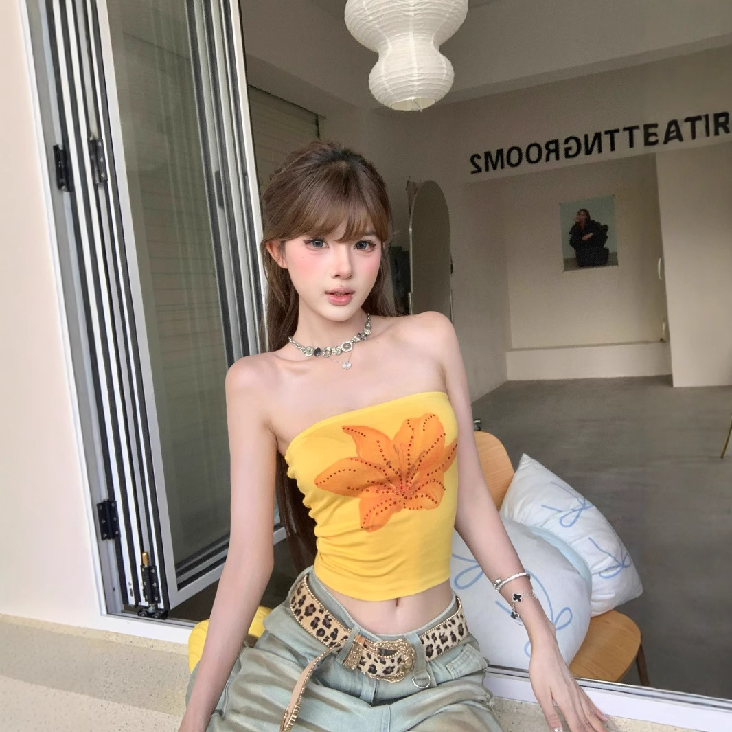 アメリカンレトロピュアディザイアホットガールフラワープリントチューブトップキャミソール女性の 2025 夏の新しいタイトトップトレンディ