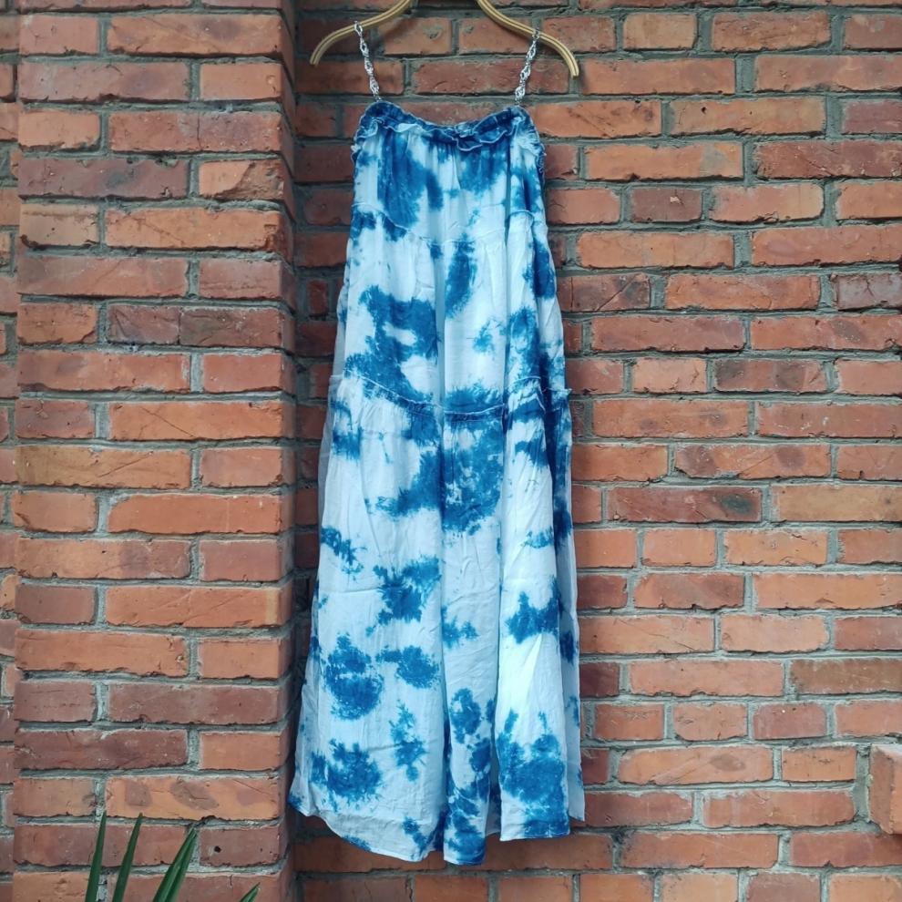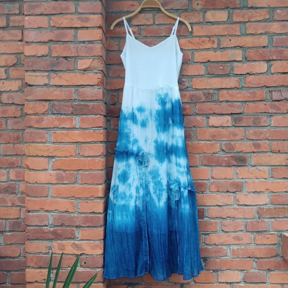 大理観光写真ロングスカート純植物イサティス手作り絞り染めブルー染めプリーツVネックサスペンダースカートドレス