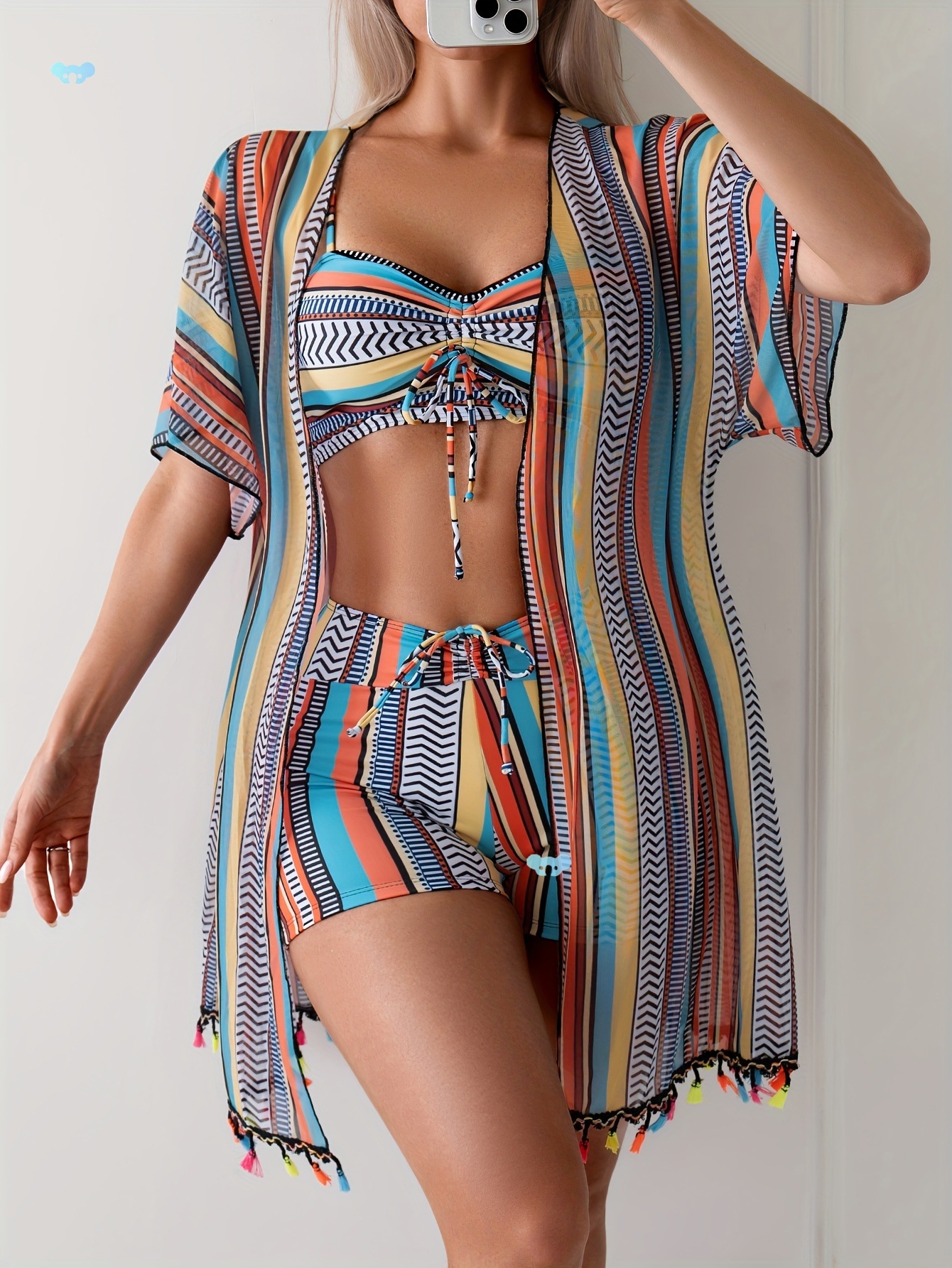 レディース 3 点ストライプ ビキニ水着セット カバーアップ付き