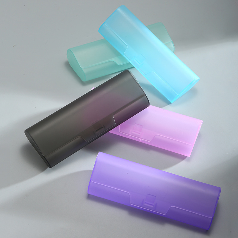 工場出荷のプラスチック製メガネケース、携帯用老眼鏡ケース、プラスチック製透明近視メガネケース、フリップカバー付きロゴ入り収納ケース