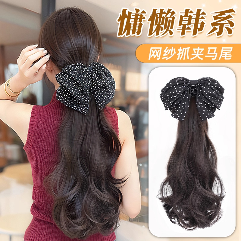 马尾假发抓夹女仿真发气质慵懒波点蝴蝶结卷发低扎蓬松网纱假发辫