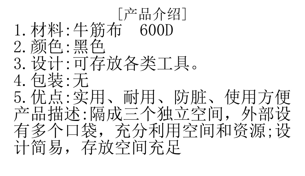 【材 质】:600D牛筋布防水面料