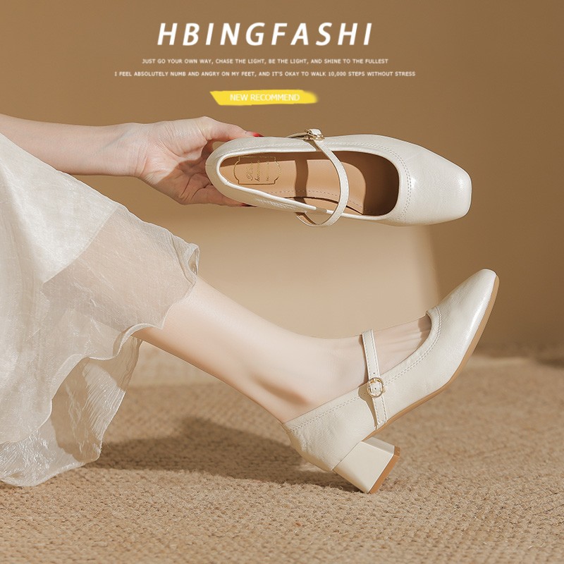 牛革バージョン~女性用フレンチジェントルシングルシューズ、太ヒールスクエアトゥチャイナドレスシューズ、気質通勤ワンストラップメリージェーンシューズ。