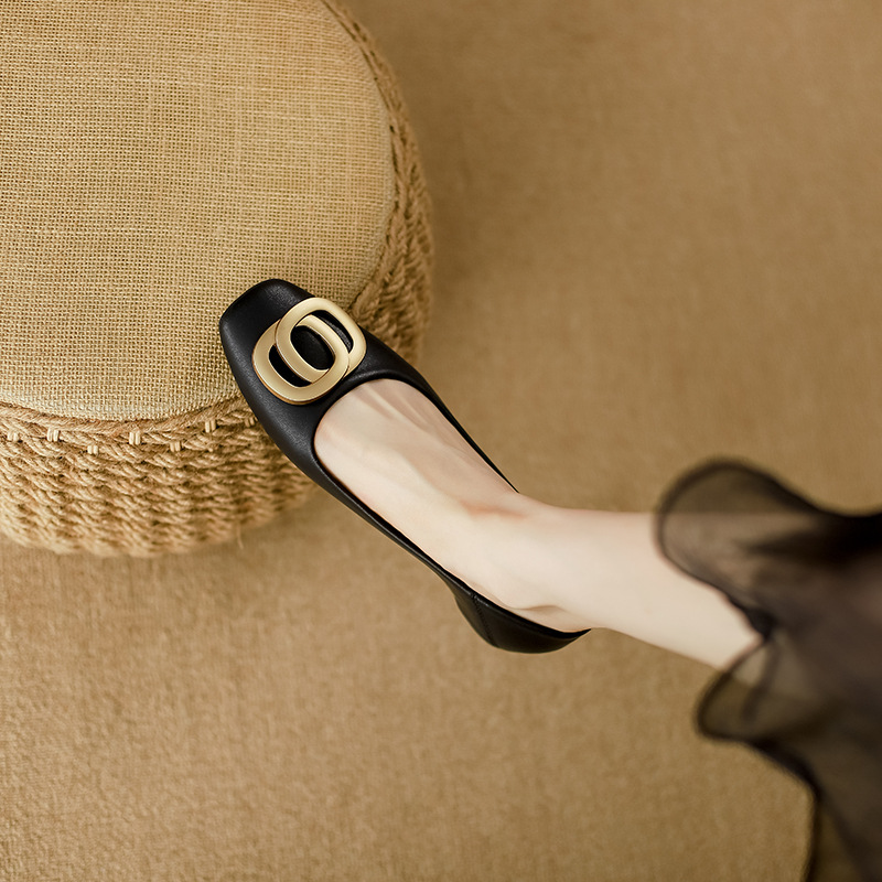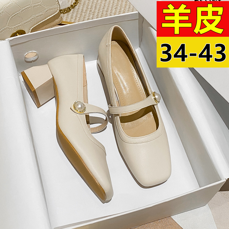 羊革本革2025春秋本革ハイヒール太ヒール革靴メリージェーンシューズスクエアトゥ浅口シングルシューズレディースシューズ42
