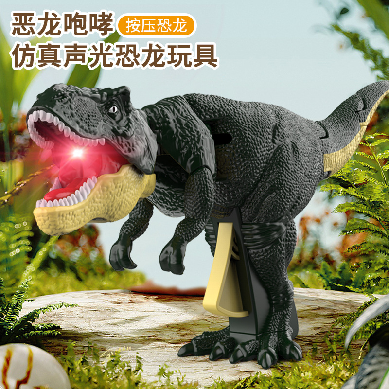 プレス恐竜おもちゃは揺れ、音を立て、ドラゴンの咆哮、恐竜のおもちゃは噛みます、プレスティラノサウルスの首が揺れる恐竜