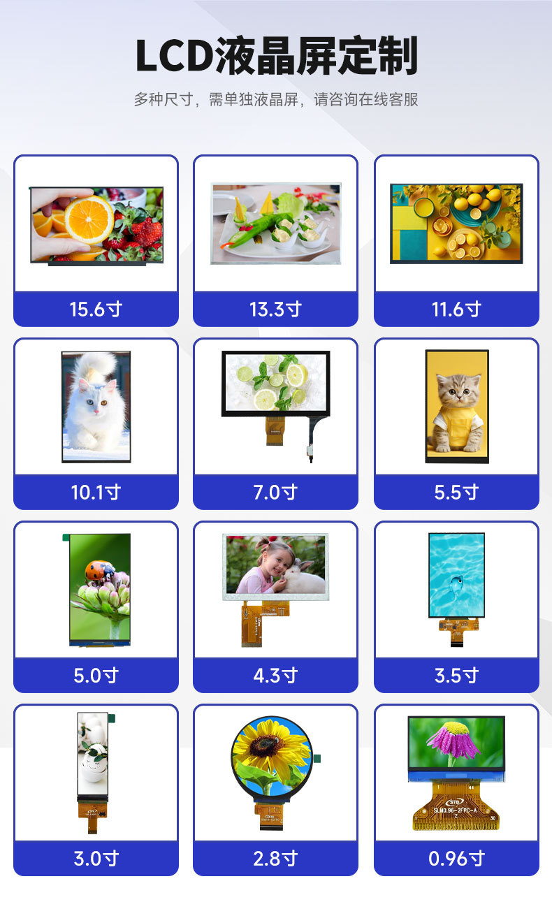 本公司生产有0.96寸1.44寸1.77寸2寸2.4寸2.8寸5寸...15.6寸等一系列液晶屏