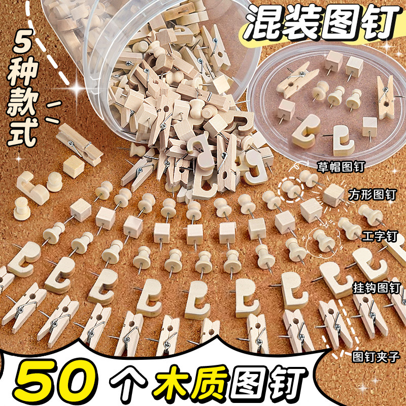 创意原木木质图钉实木软木板照片墙按钉工字不锈钢透明螺旋钉组合