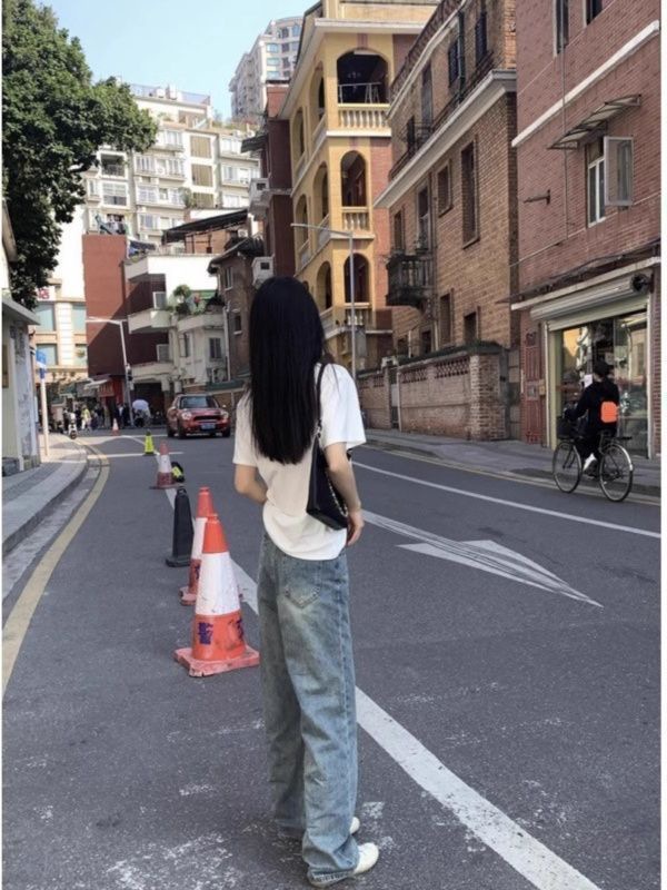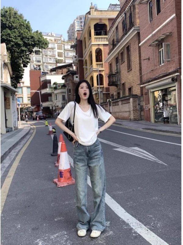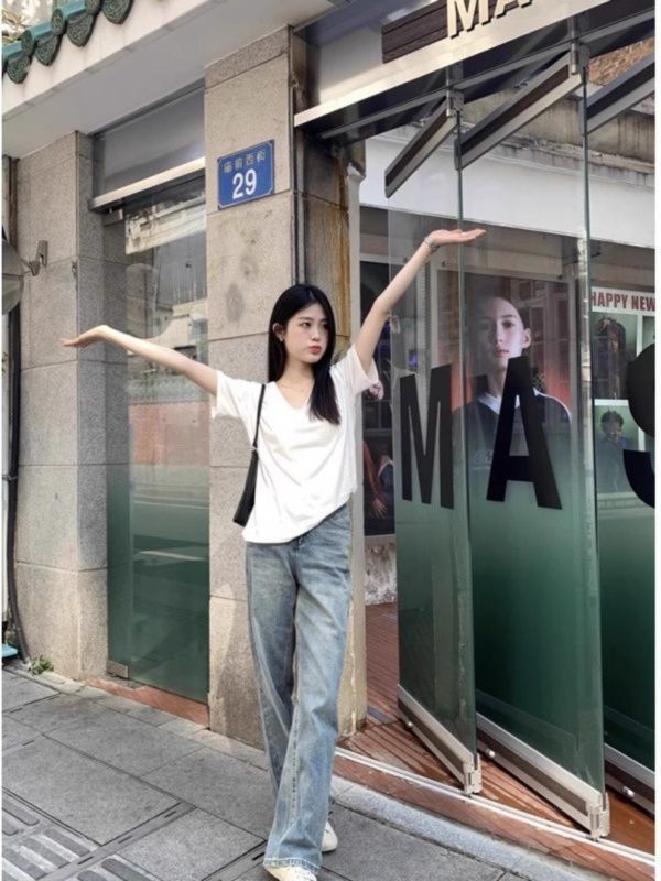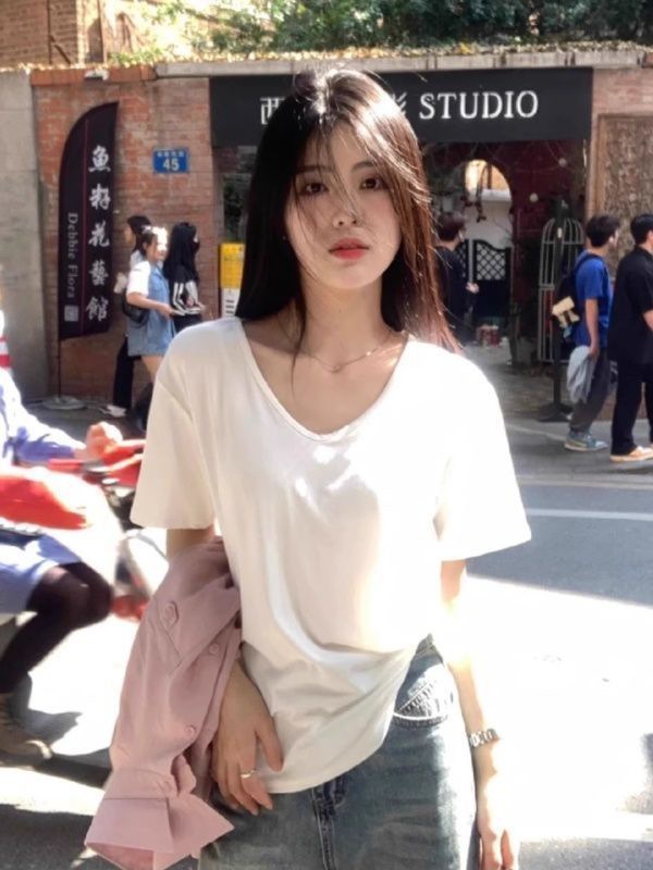 白いvネック半袖tシャツ女性夏2025新型ゆるい純色シャツの中にギャル学生上着が入っている