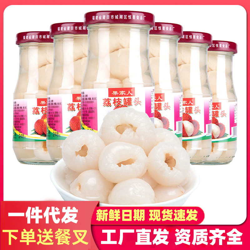 果家人荔枝罐头厂家一件批发玻璃瓶糖水水果罐头248g*6罐商用整箱