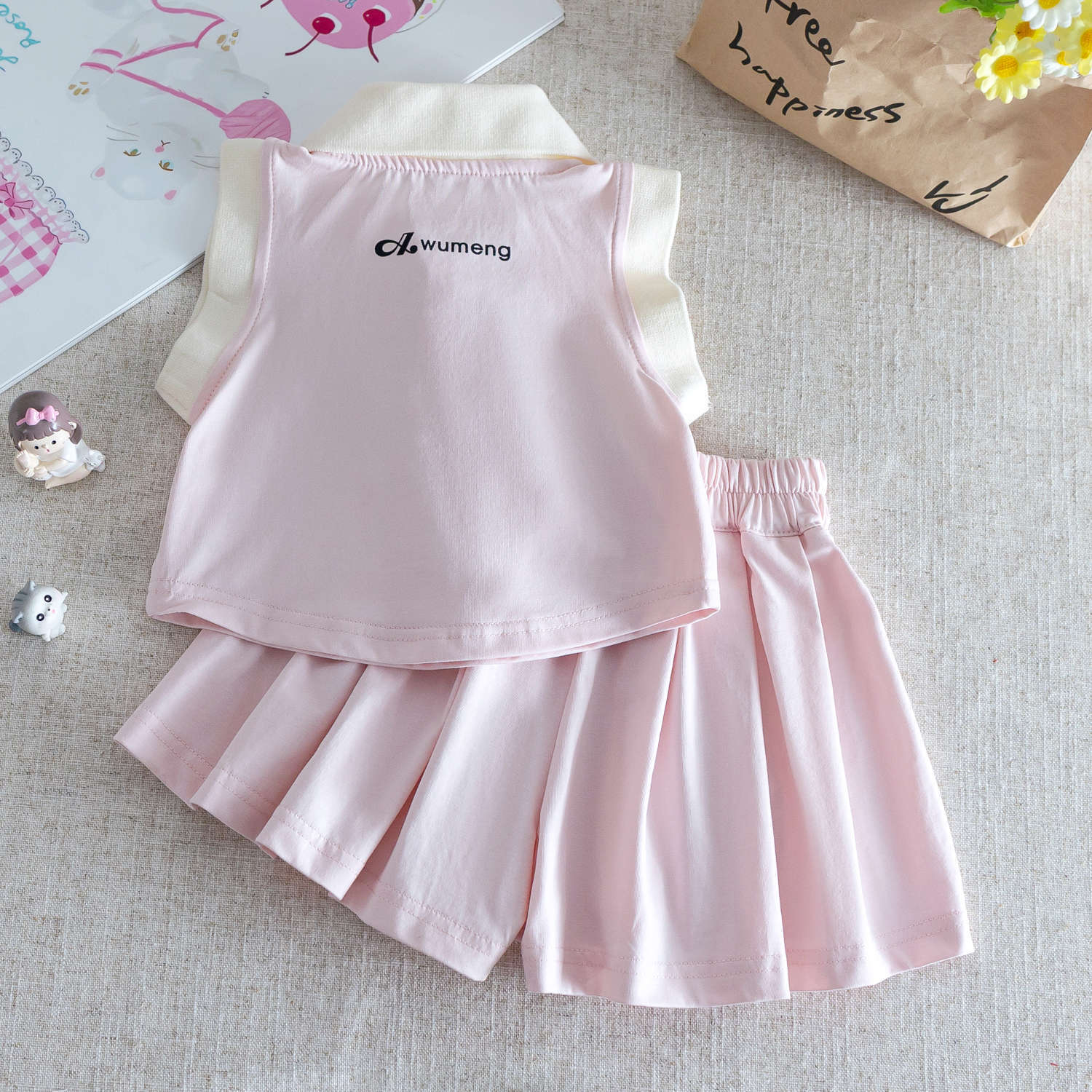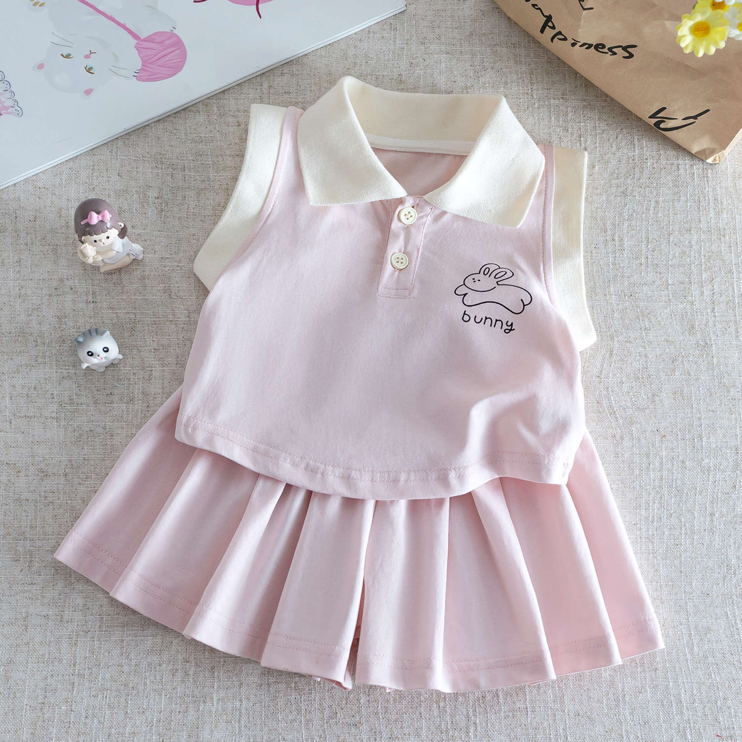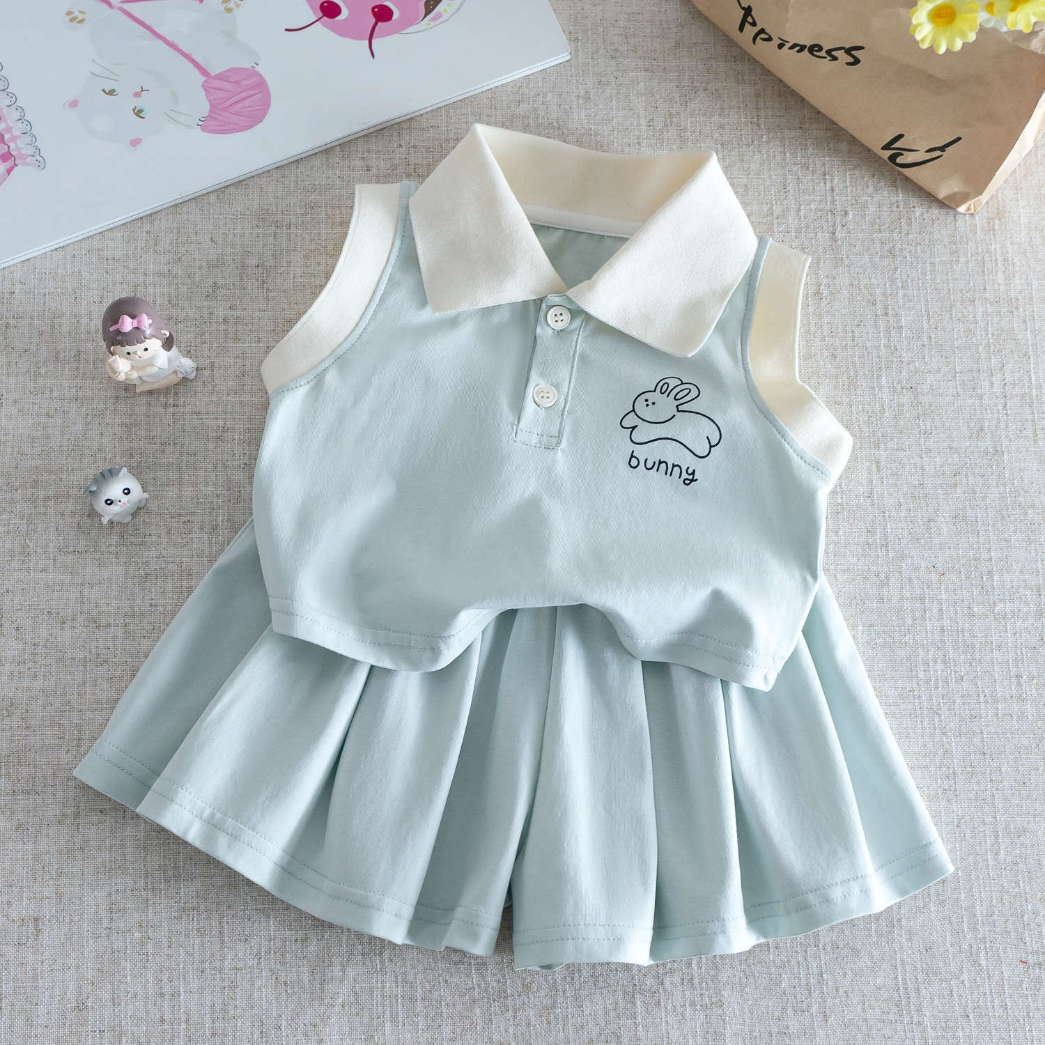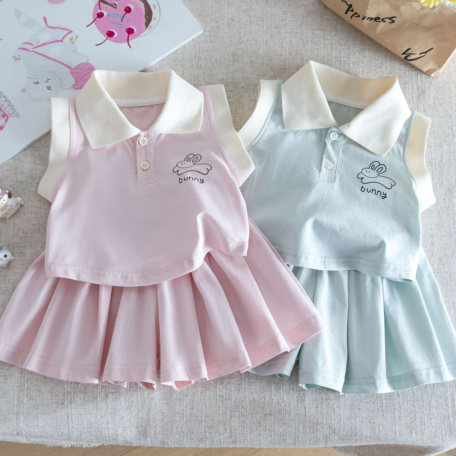 小さな女の子の夏の新鮮でかわいいポロカラーノースリーブベストt+万能プリーツショーツカレッジスタイルツーピーススーツ