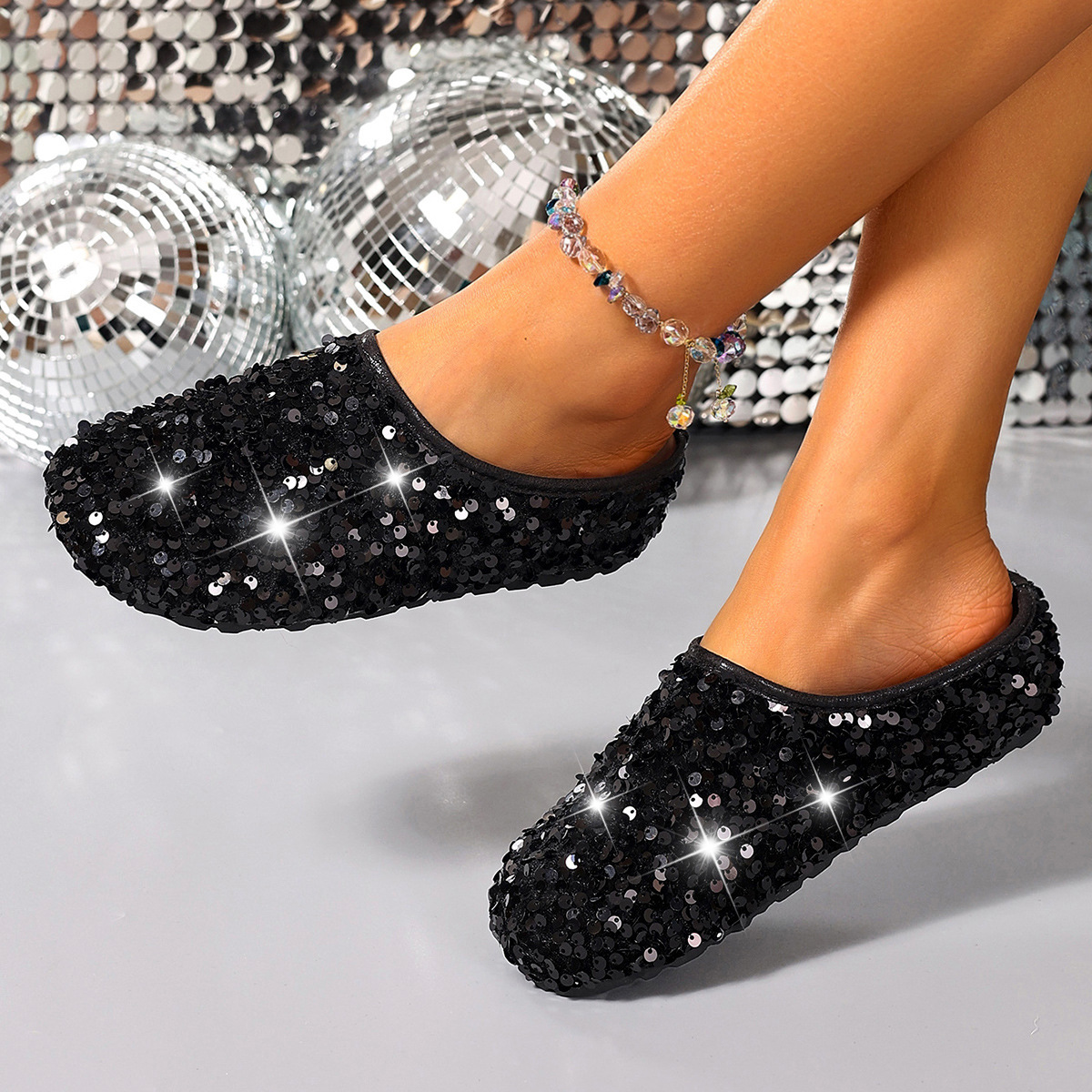 跨境外贸亮片懒人包头厚底拖鞋2026欧美时尚新款圆头平底大码拖鞋