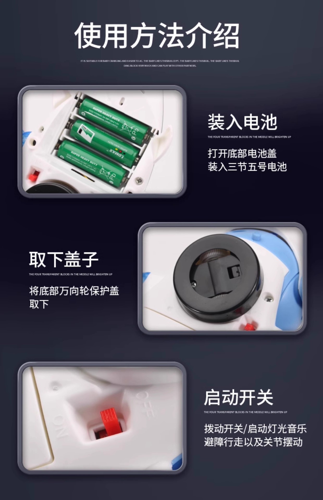 注目の機能 電動ユニバーサル、自動障害物回避、クールな照明、ダイナミックな音響効果